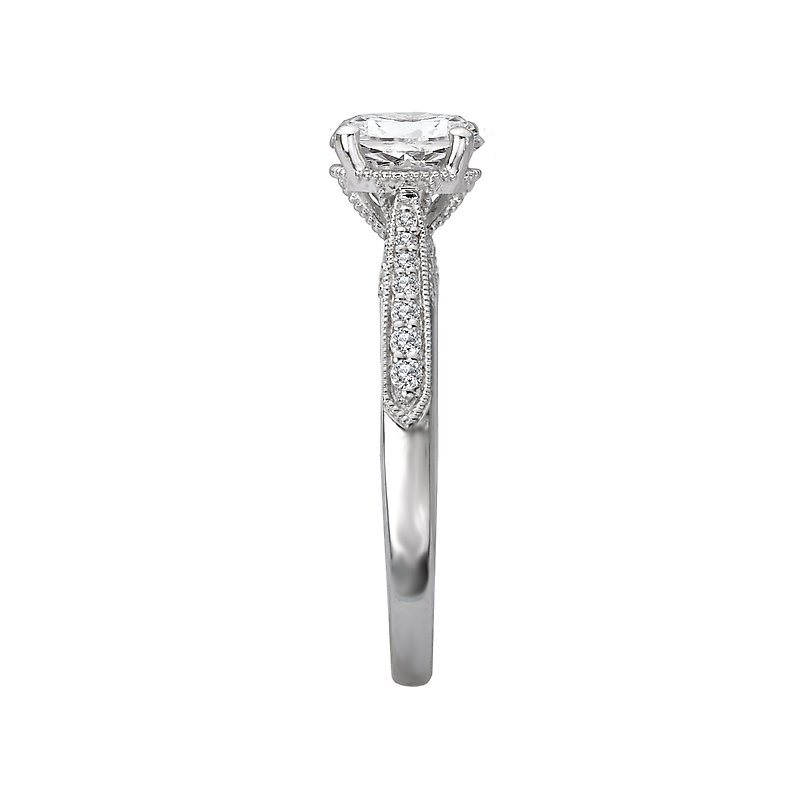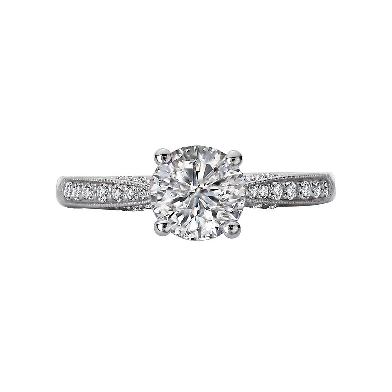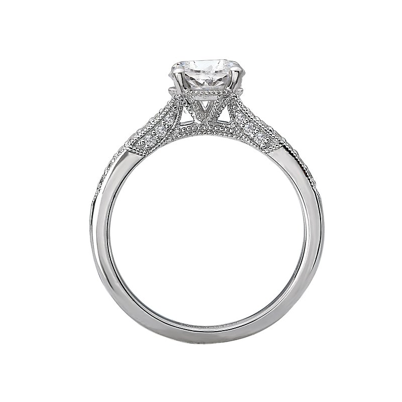 This engagement ring showcases tapered sparkling round diamonds set in high polished 14kt white gold accented with milgrain detail. (D 1/7 carat total weight) This ring is a SEMI-MOUNT and it comes with NO CENTER STONE as shown but it will accommodate a 6.5mm round center stone.