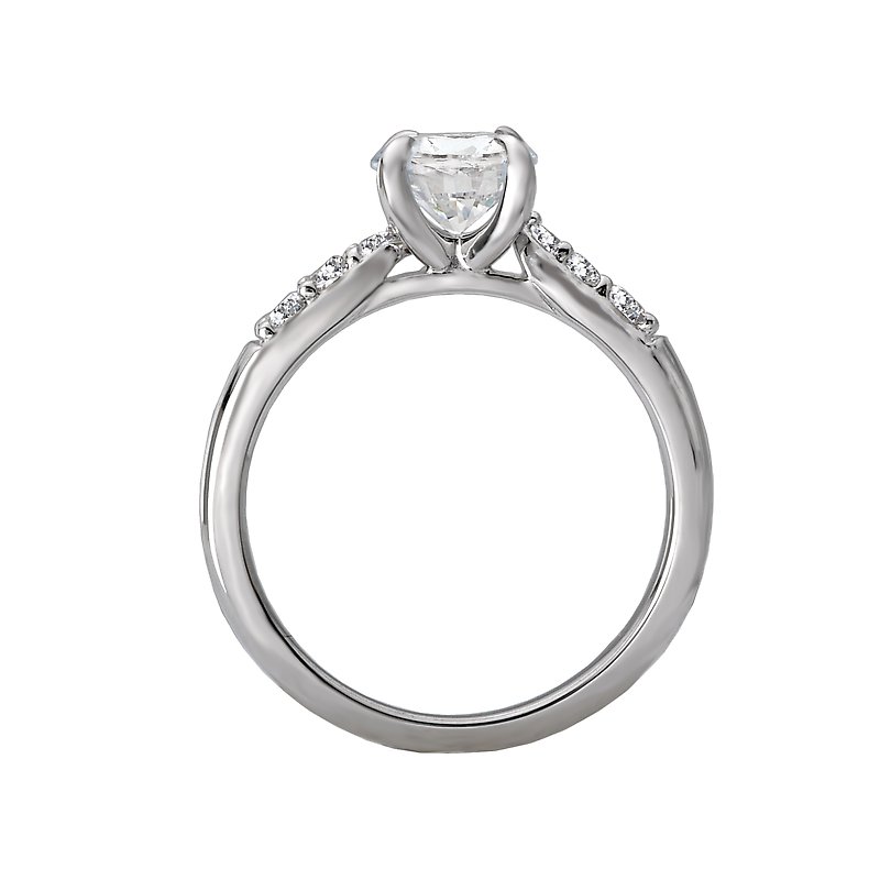 This bridal ring showcases tapered sparkling diamonds surrounding the claw prong setting created in 14kt white gold. (D. 1/6 carat total weight) this item is a SEMI-MOUNT and it comes with NO CENTER STONE but it will accommodate a 6.5mm round center diamond.
