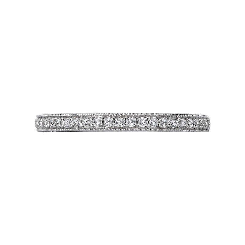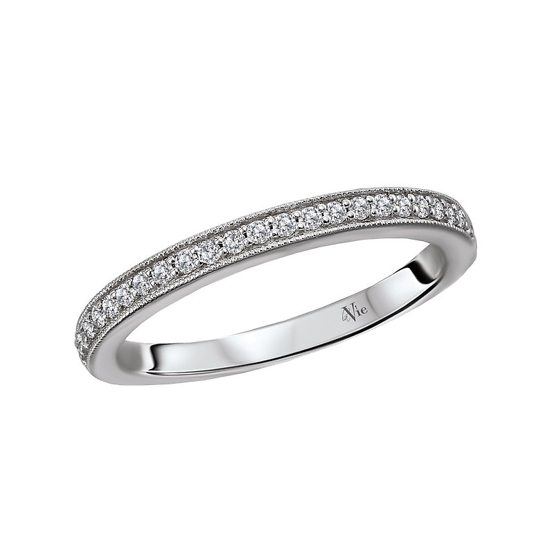 This is a matching wedding band created with round faceted diamonds and milgrain crafted in high polished 14kt white gold. (D 1/7 carat total weight)