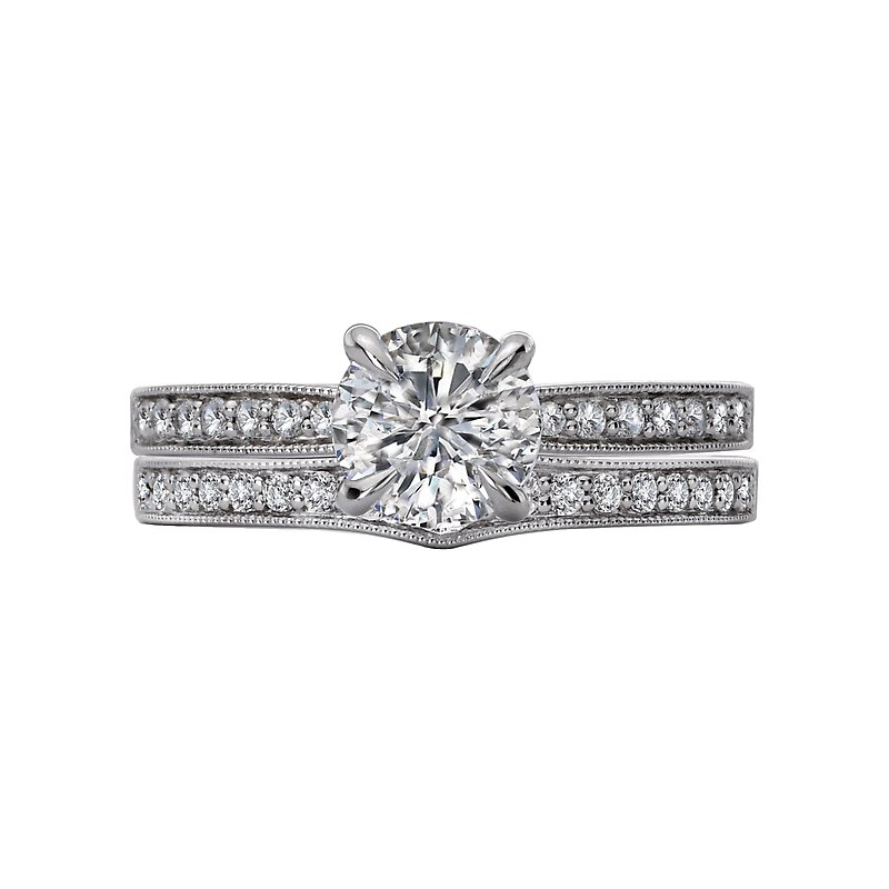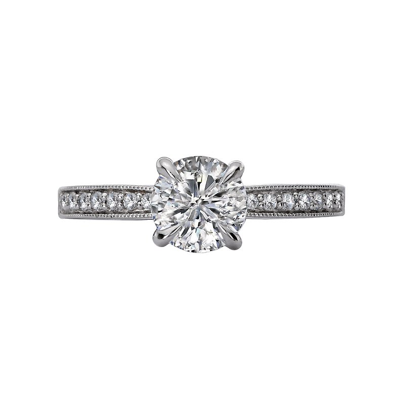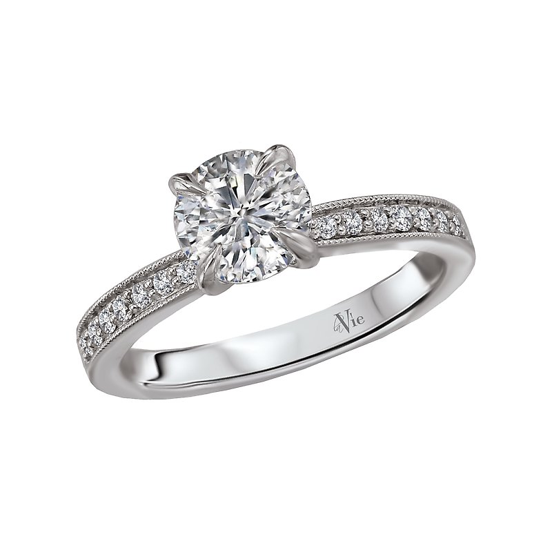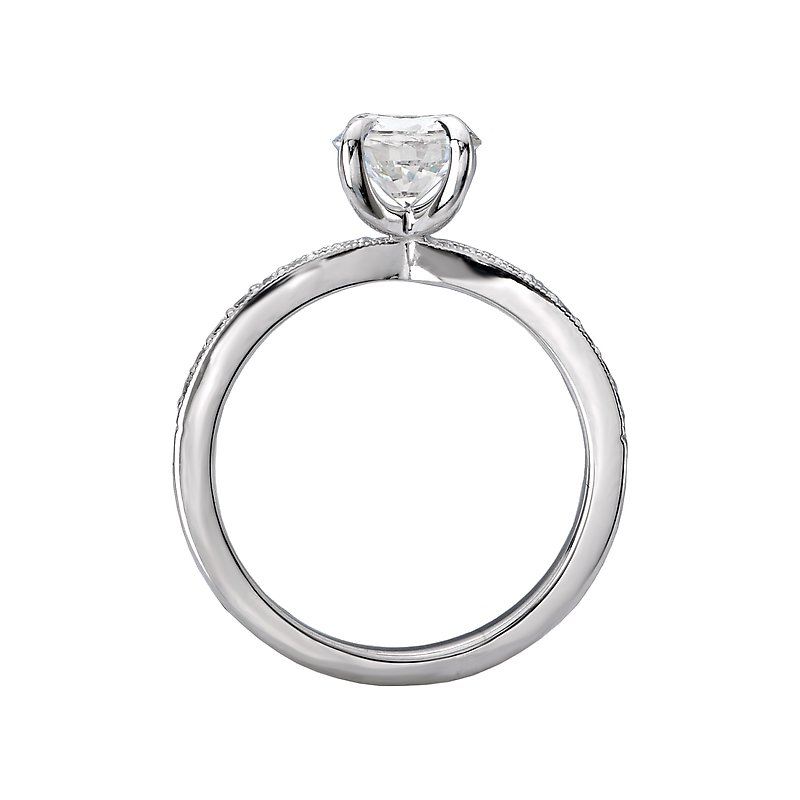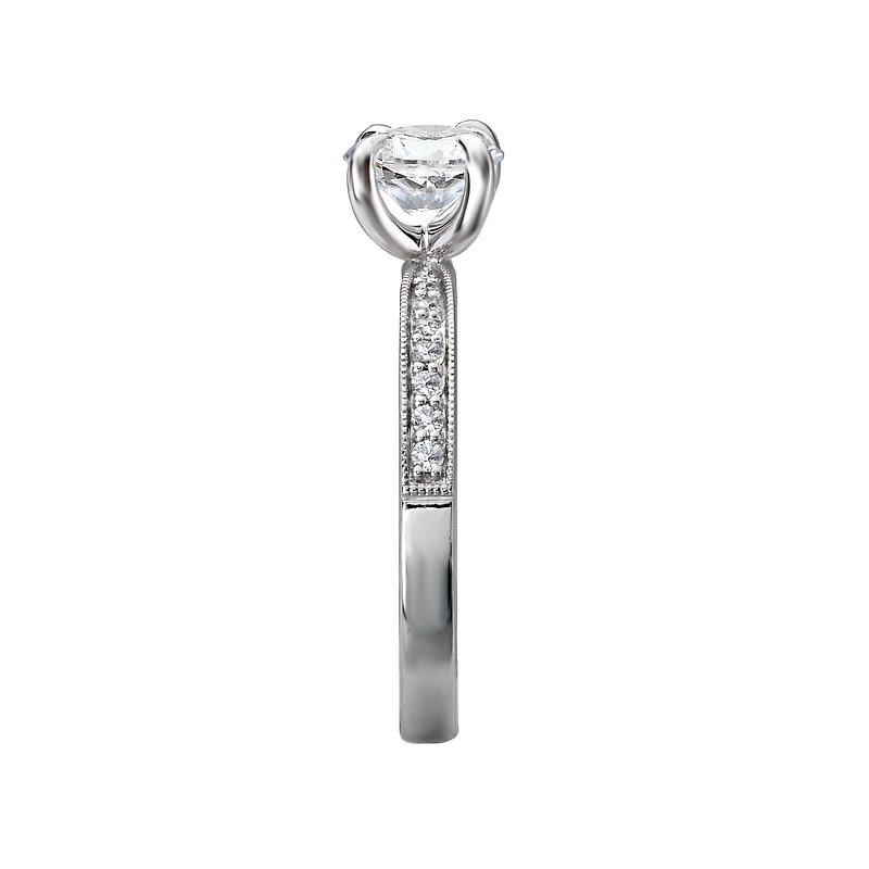 This engagement ring showcases sparkling diamonds set in high polished 14k white gold with accents of milgrain detail. (D 1/8 carat total weight) This ring is a semi-mount and comes with no center stone but will accommodate a round center stone a 6.5mm round diamond center.
