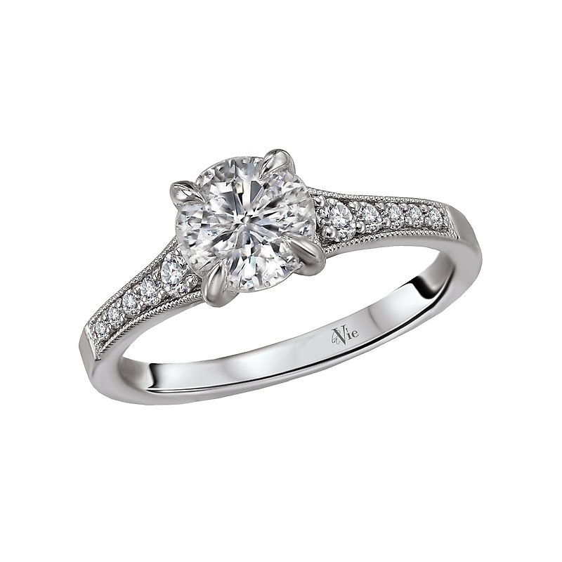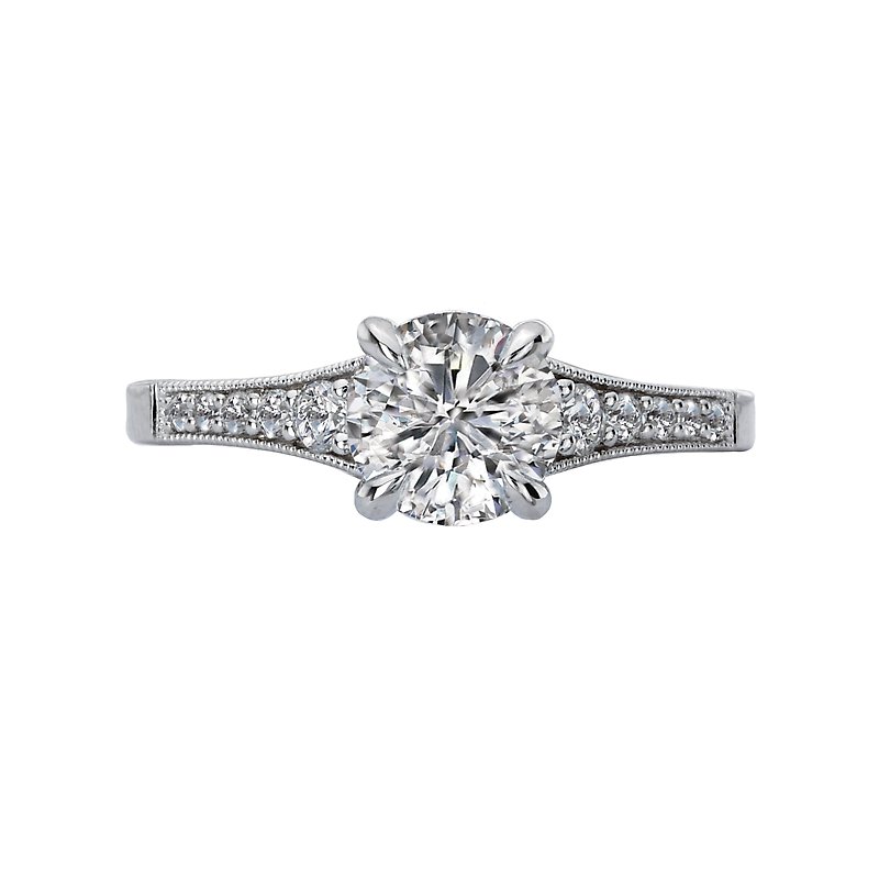 Engagement ring displays tapered sparkling diamonds set in high polished 14kt white gold outlined with milgrain detail. (D 1/6 carat total weight) This ring is a SEMI-MOUNT and it comes with NO CENTER STONE as shown but it will accommodate a 6.5mm round center stone.