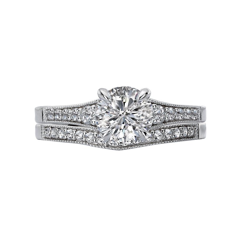 This curved wedding band features round faceted diamonds set in 14kt white gold surrounded by milgrain detail. (D 1/8 carat total weight)