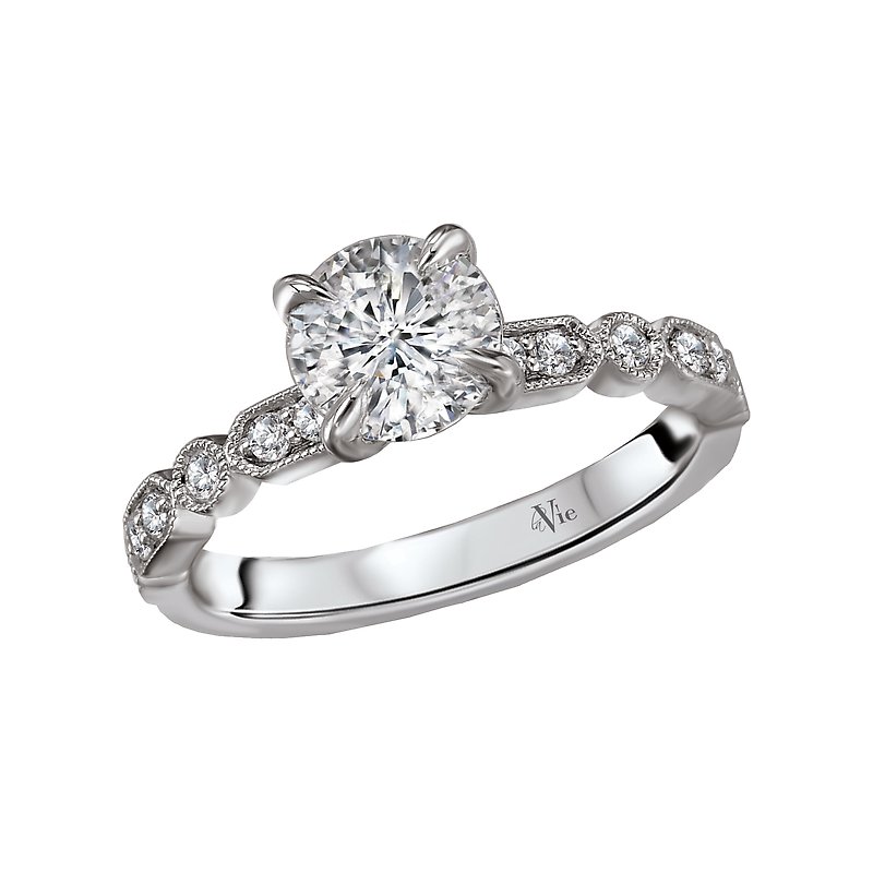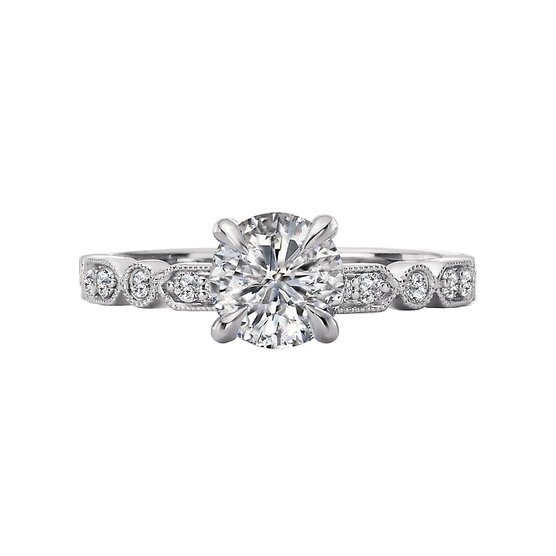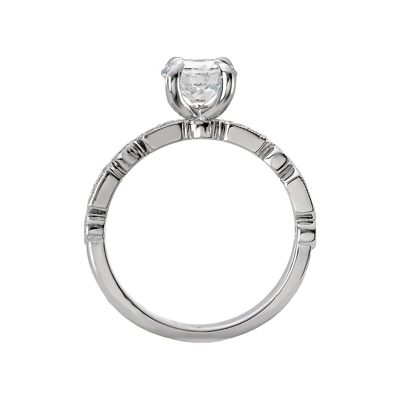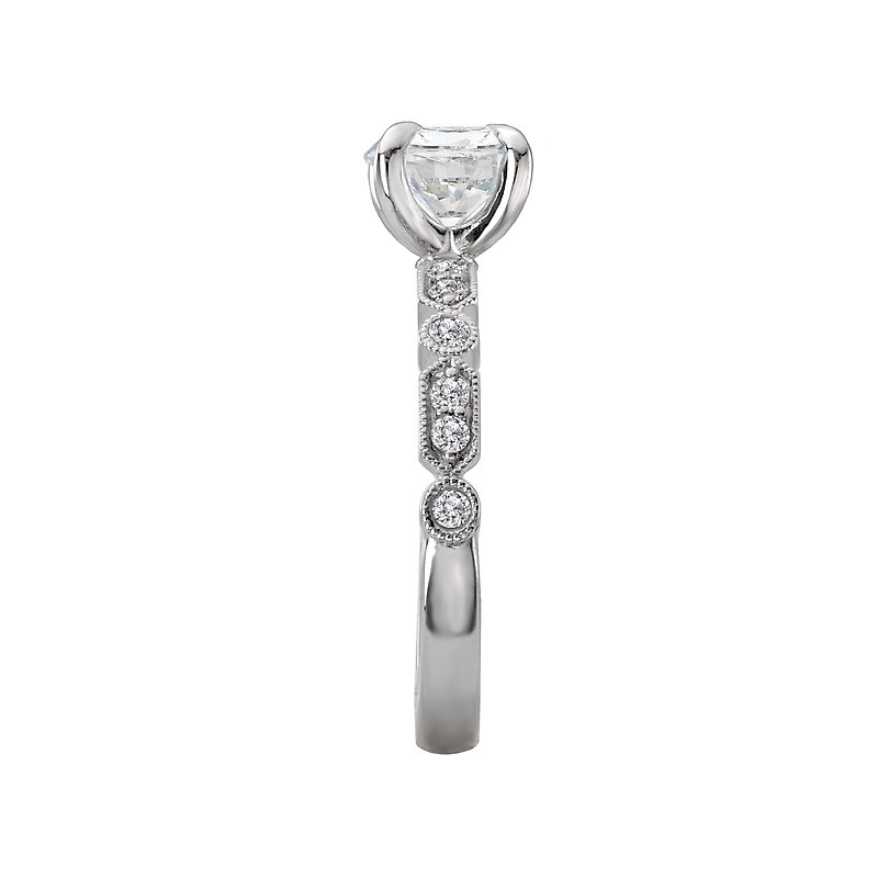 This engagement ring showcases sparkling round diamonds set in high polished 14kt white gold trimmed in milgrain. (D 1/5 carat total weight) This ring is a SEMI-MOUNT and it comes with NO CENTER STONE as shown but it will accommodate a 6.5mm round center stone.
