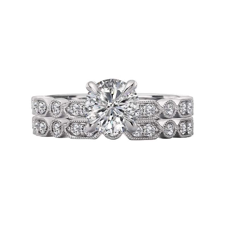 This is a matching wedding band created with round faceted diamonds set in high polished 14kt white gold and milgrain details. (D 1/5 carat total weight)