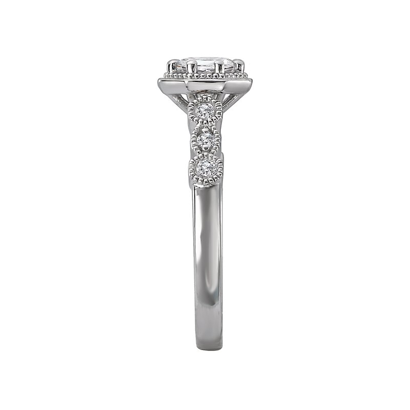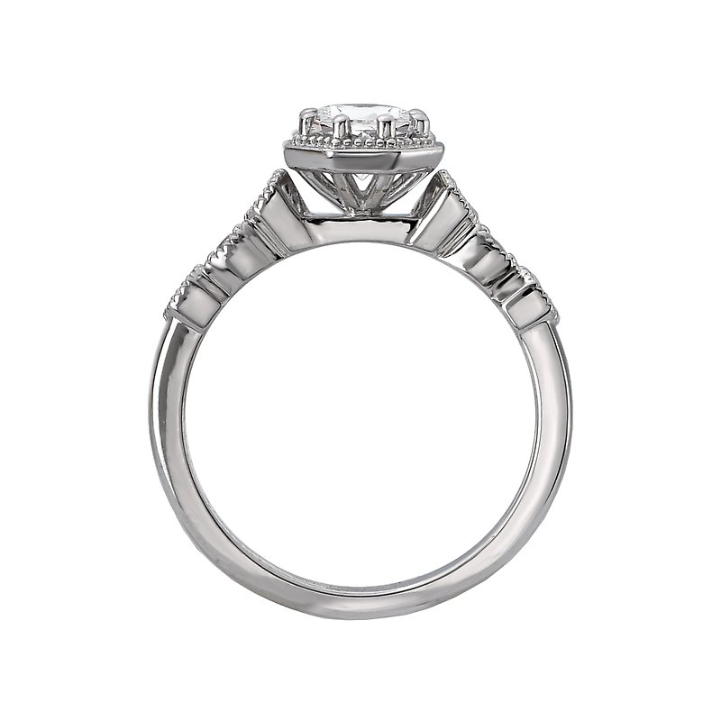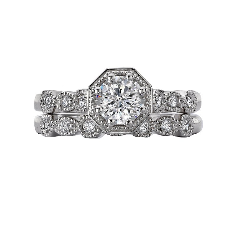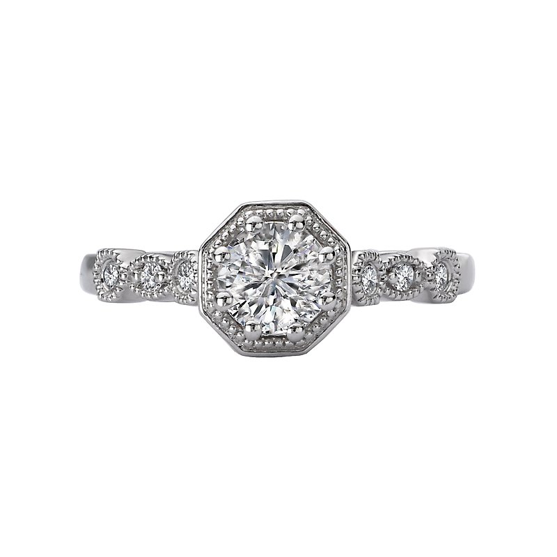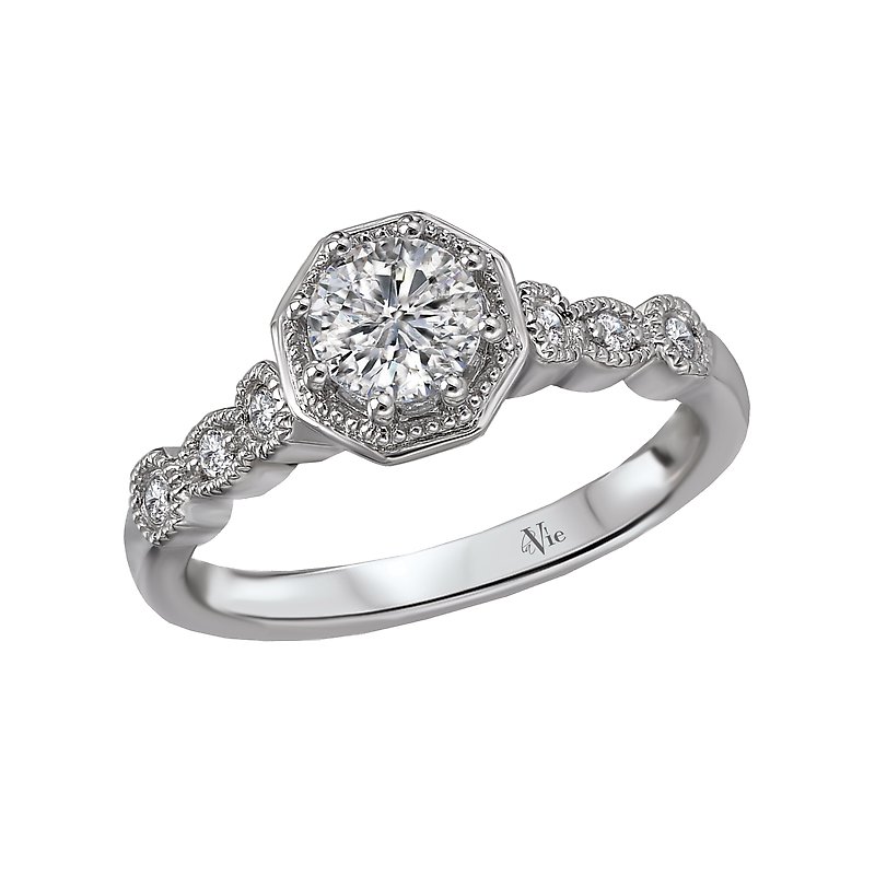 This 14k white gold bridal ring features geometric shapes with diamond centers lined with milgrain detail. (D .09 carat total weight) This ring is a SEMI-MOUNT and it comes with NO CENTER STONE as shown but it will accommodate a 5.6mm round diamond center.