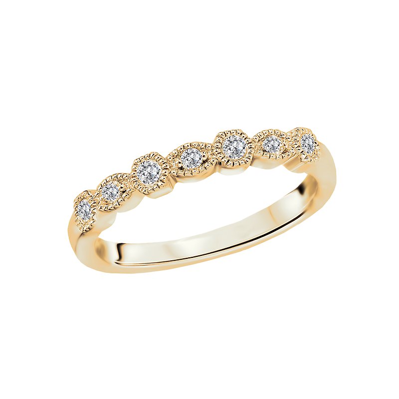 Wedding band features round faceted diamonds set in high polished 14k yellow gold accented with milgrain detail. (D 1/10 carat total weight)