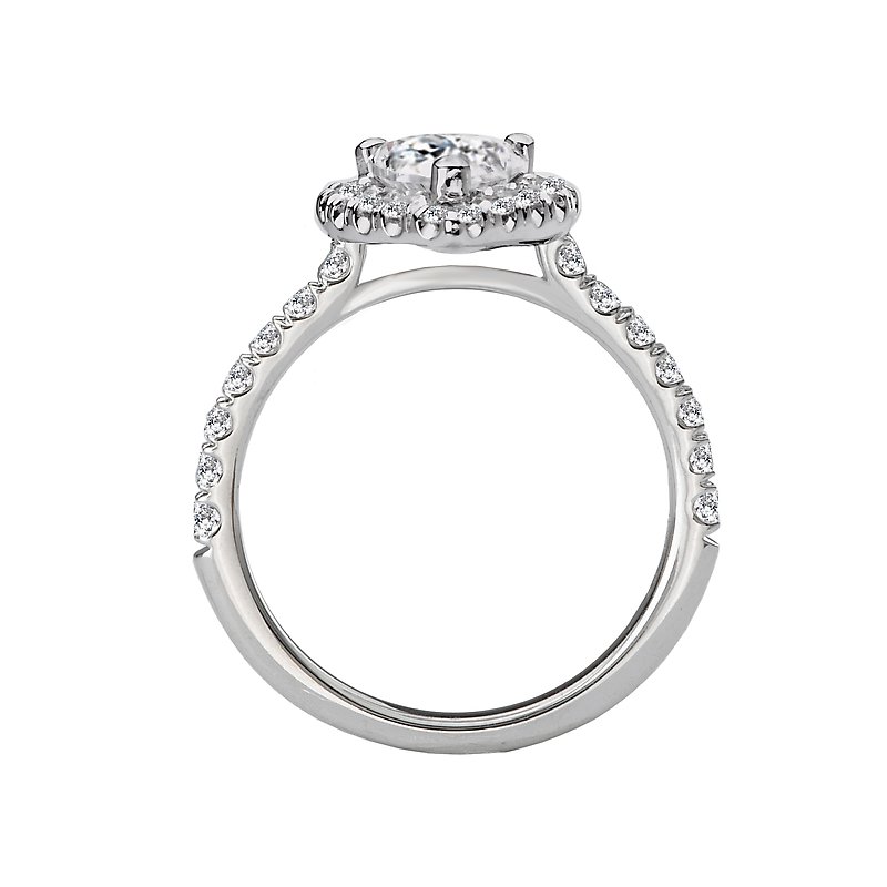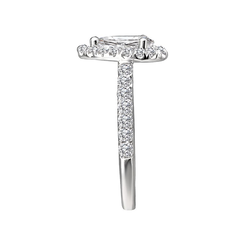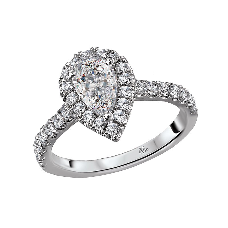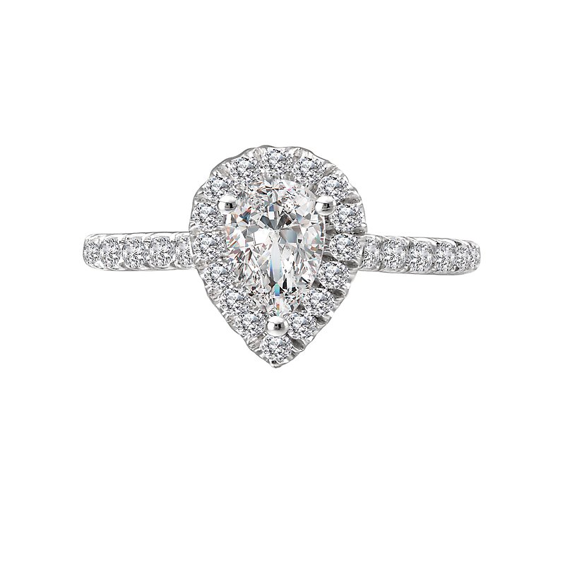 This elegant ring features a halo center created with round sparkling diamonds set in 14K white gold. (D 5/8 carat total weight) This ring is a SEMI-MOUNT and it comes with NO CENTER STONE as shown but it will accommodate a 8x5.5mm pear cut center stone.