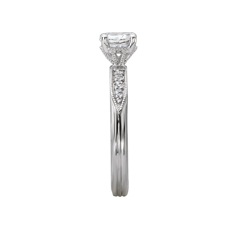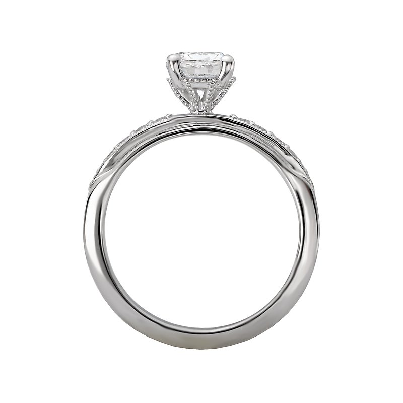 Graduated diamonds sparkle along the shank of this beautiful engagement ring. This ring aligned with milgrain detail is crafted in high polished 14k white gold. (D 1/8 carat total weight) This SEMI-MOUNT ring comes with NO CENTER STONE as shown but it will accommodate a 5.8mm round center stone.