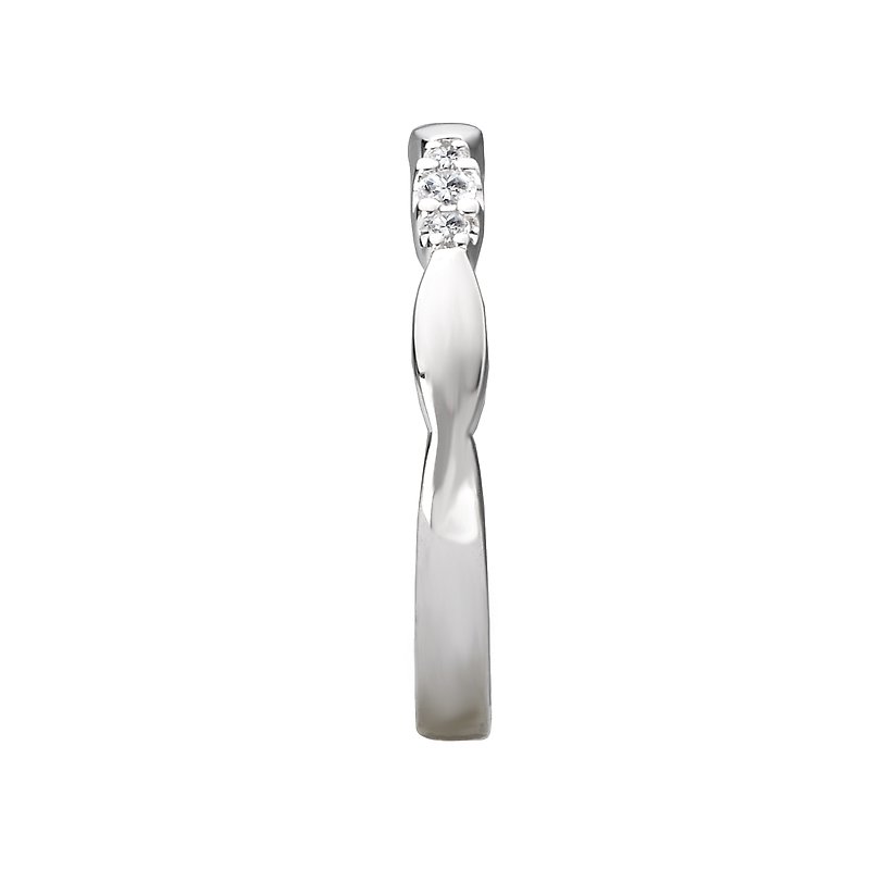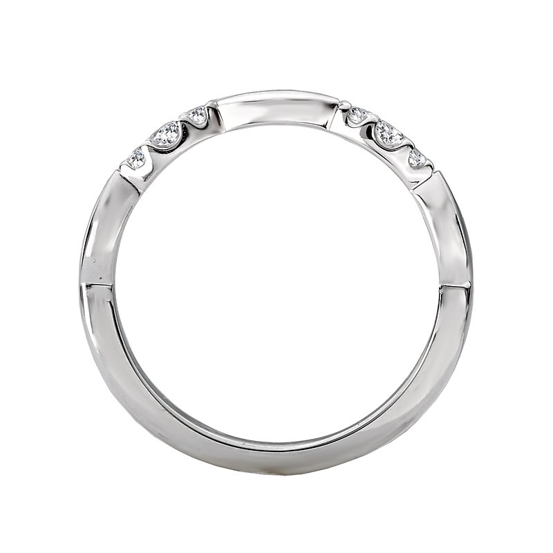 This unique wedding band aligned with round brilliant cut diamonds is crafted in 14kt white gold. (D 1/7 carat total weight)