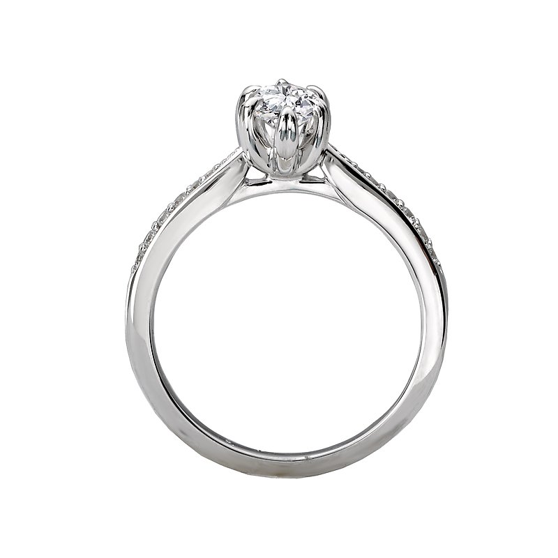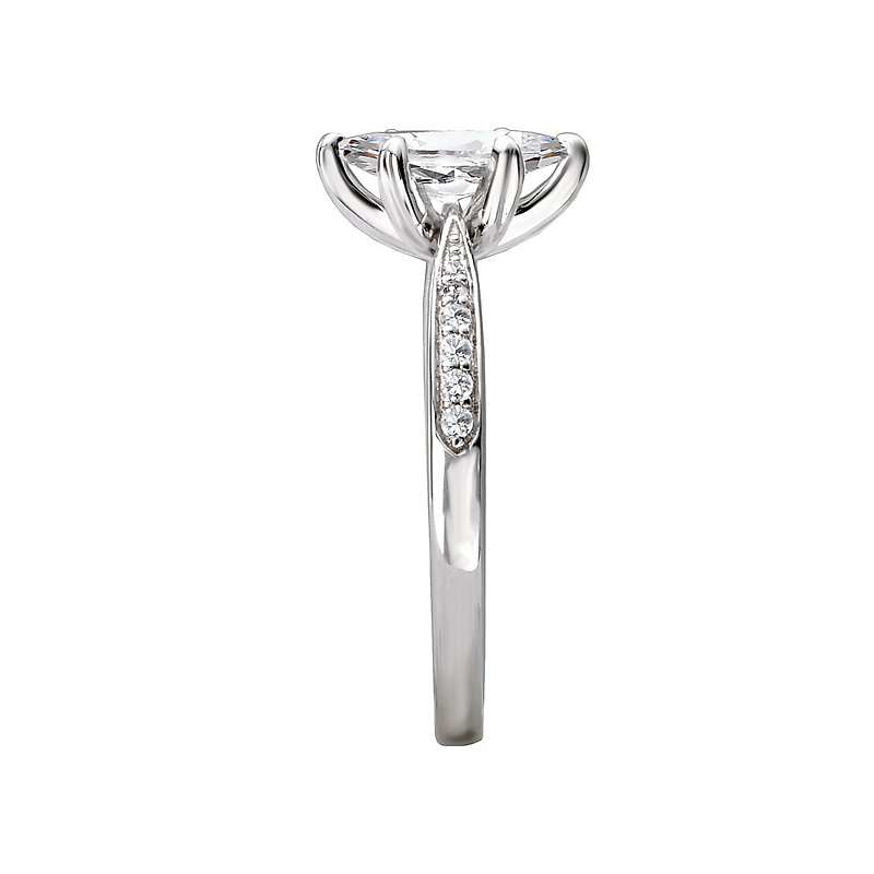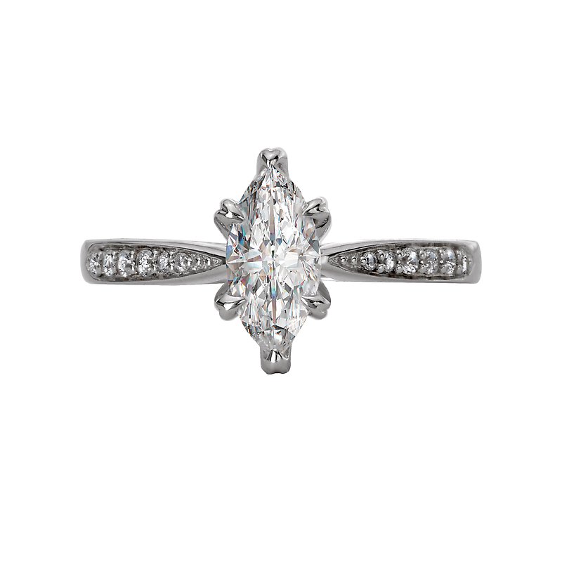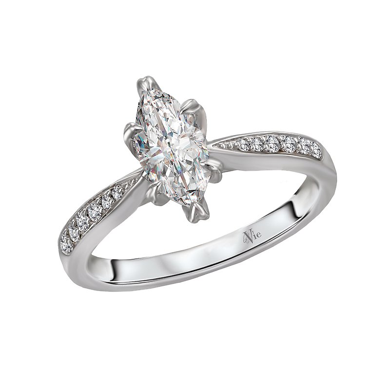 Lining the shank of this amazing beauty are sparkling brilliant cut 1/10ctw diamonds set in high polished 14k white gold. This semi mount engagement ring will accommodate a marquise 9x4.5mm diamond or gemstone.