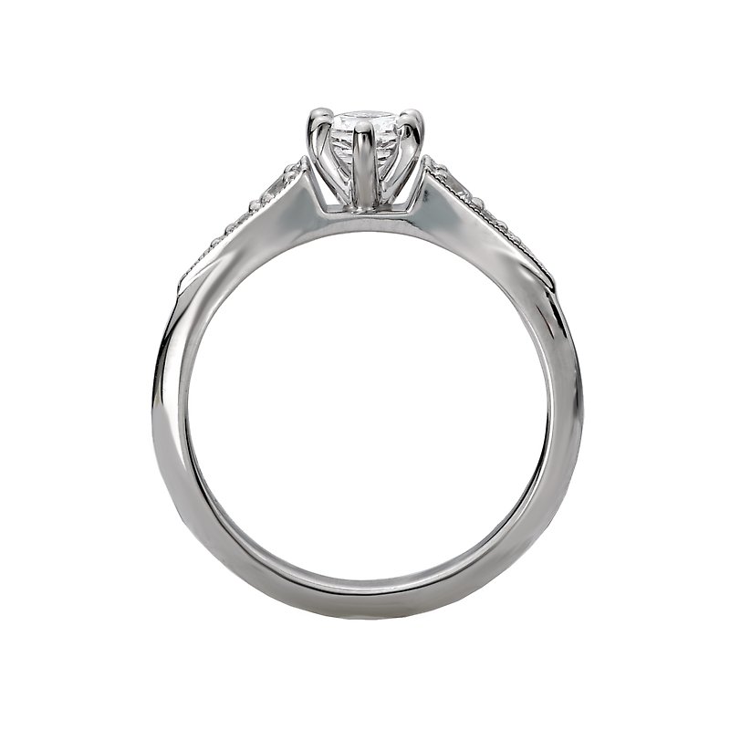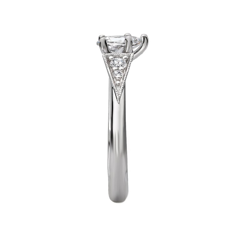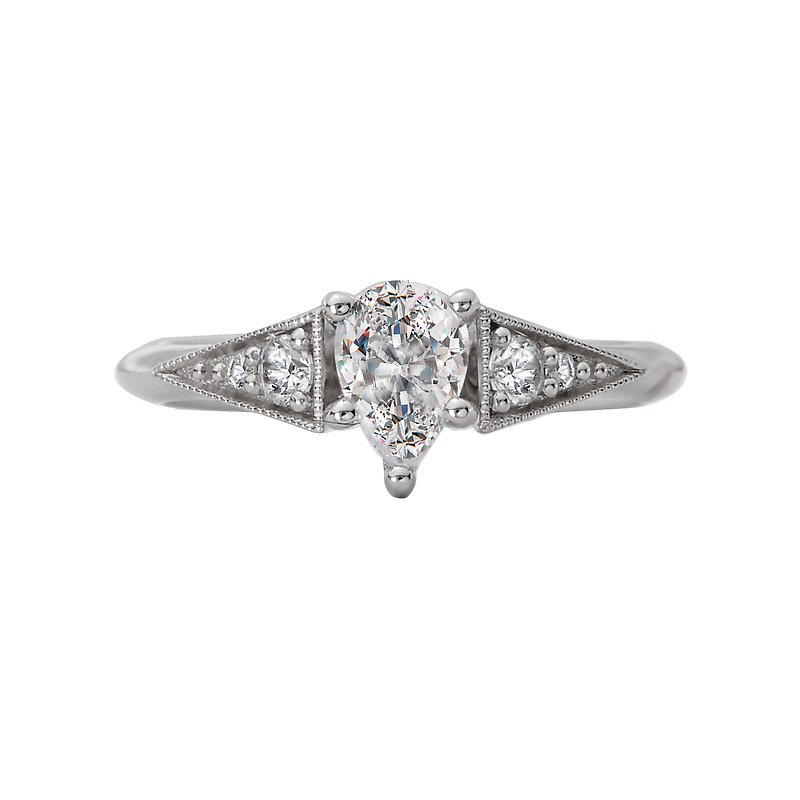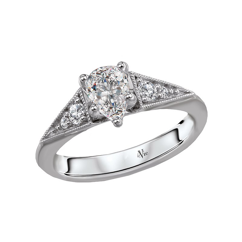 Gorgeous engagement ring embellished with milgrain detail features tapered brilliant cut diamonds aligning the shank and will accommodate a 7x5mm pear shape diamond center. (D 1/7 carat total weight)