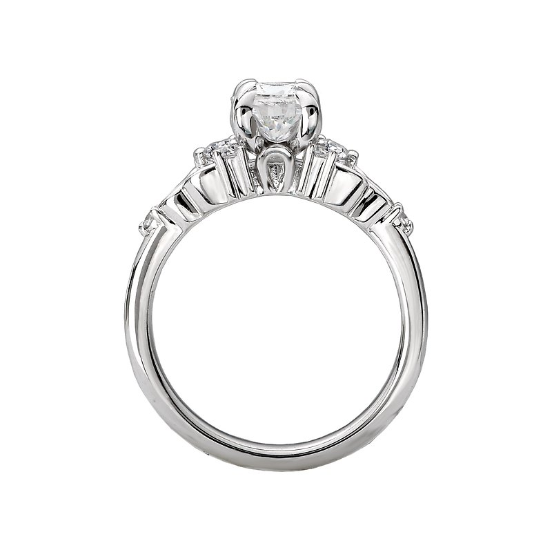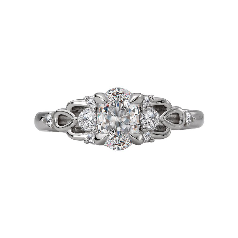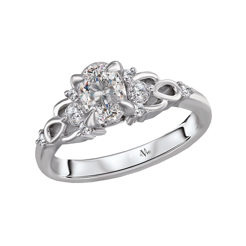 Uniquely crafted in high polished 14k white gold, this engagement ring displays ribbons of gold aligned with round brilliant cut diamonds surrounding the claw center setting that will accommodate a 7.5x5.5 oval center. (D 1/4 carat total weight)