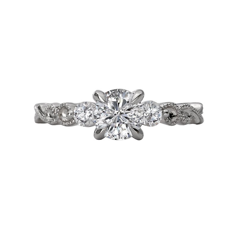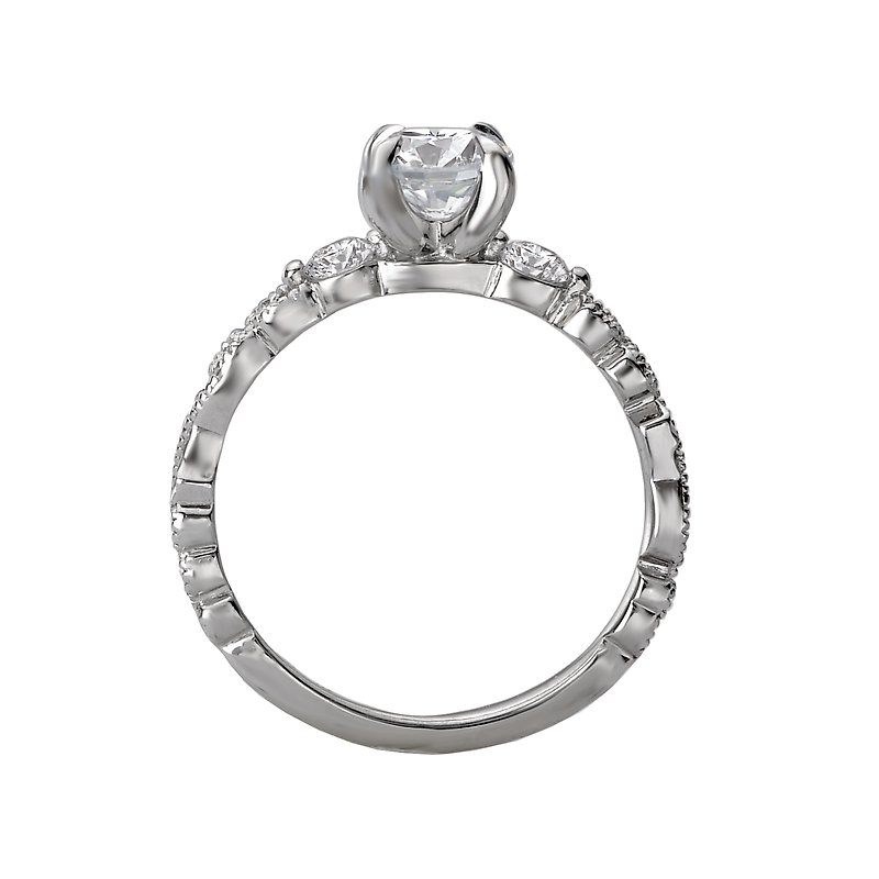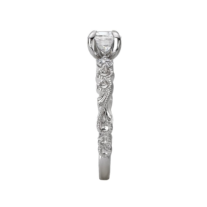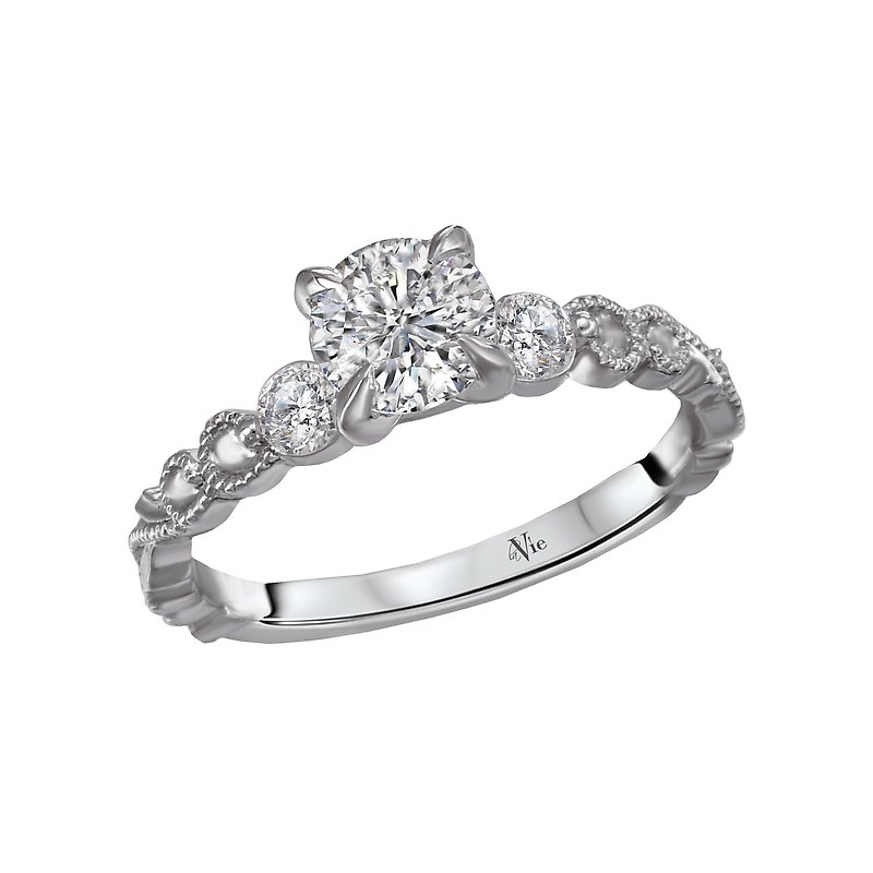 Stunning 3-stone design bridal ring showcases swirls of milgrian detail crafted in high polished 14kt white gold lining the shank. This ring will accommodate a round 5.8mm diamond or gemstone. (D 1/5 carat total weight)