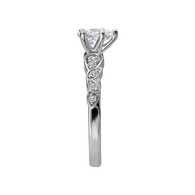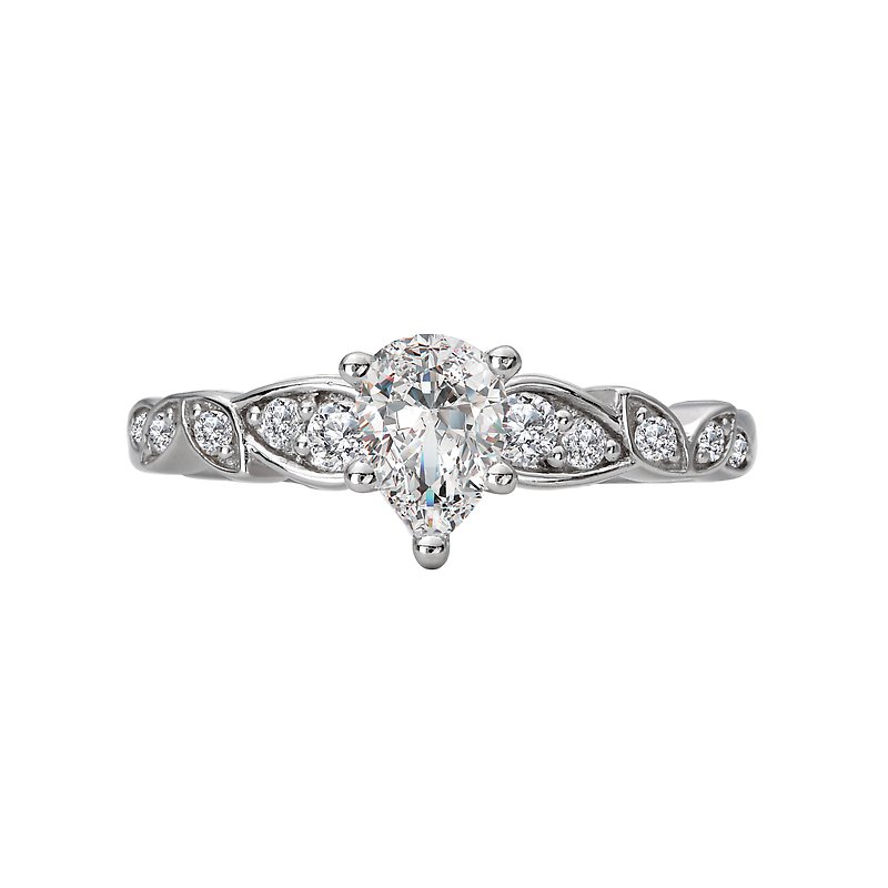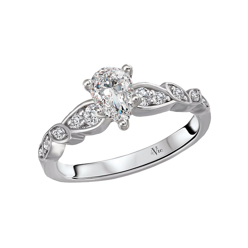 Dazzling engagement ring created in high polished 14k white gold showcases round brilliant cut diamonds surrounding the center setting that will accommodate a 7X5mm pear shaped diamond. (D 1/5 carat total weight).
