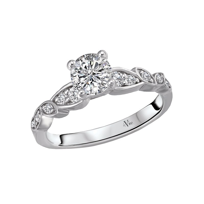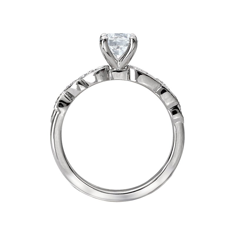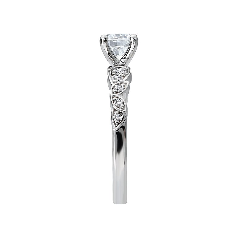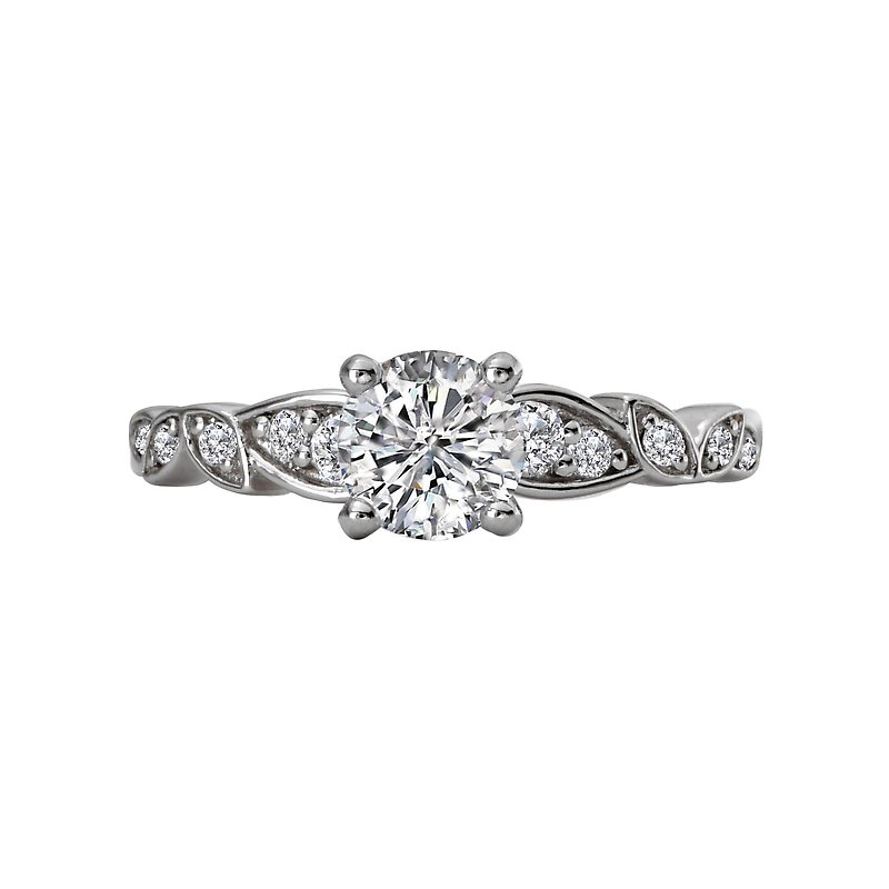 Dazzling engagement ring created in high polished 14k white gold showcases round brilliant cut diamonds surrounding the center setting that will accommodate a 5.8mm round diamond. (D 1/5 carat total weight).