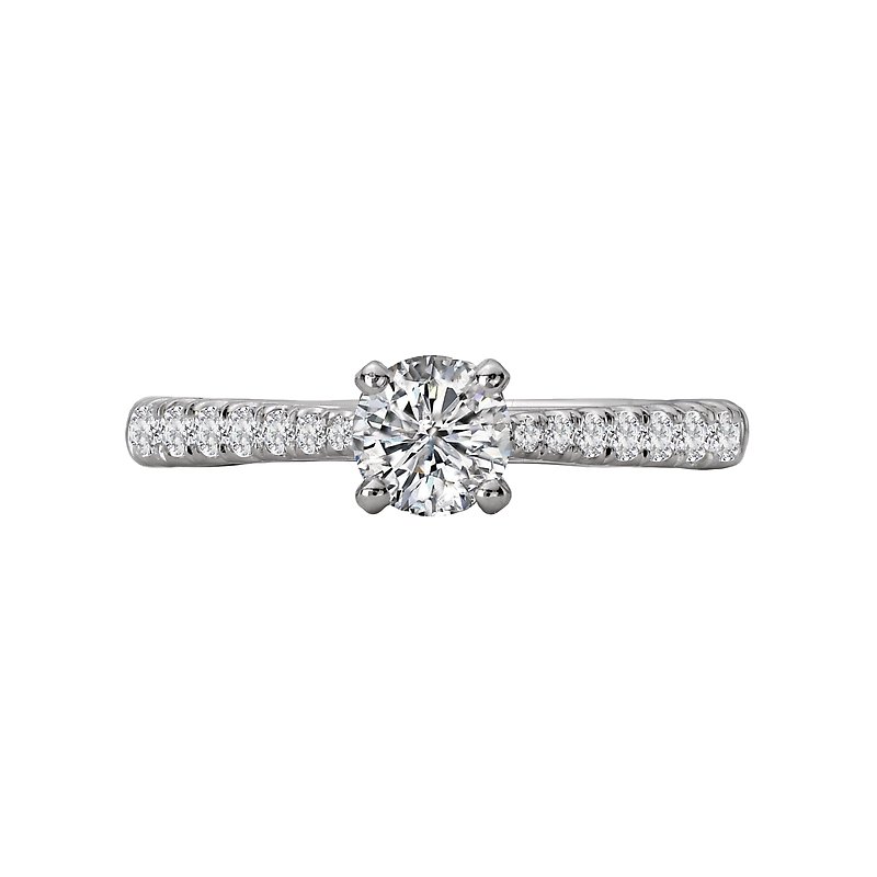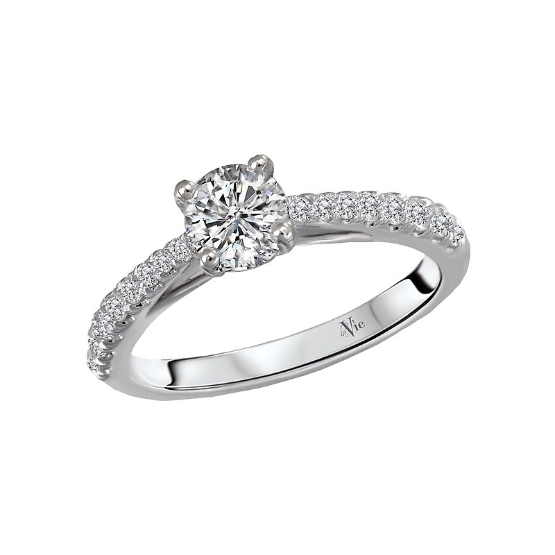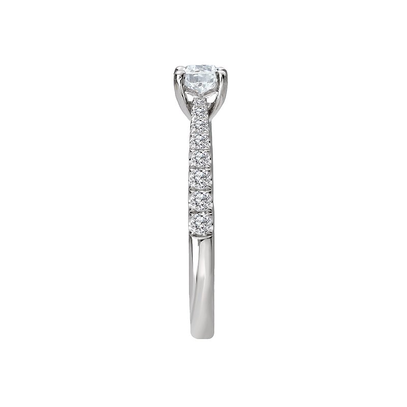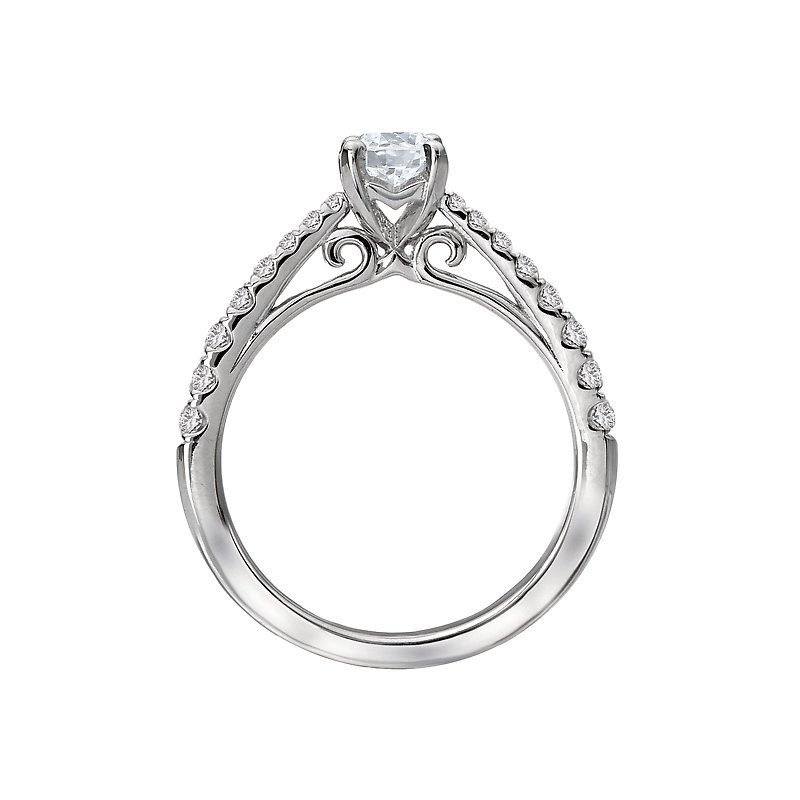 This ring created in 14k white gold features tapered diamonds on the shank with a center setting that will accommodate a 5.2mm round center. (D 1/3 carat total weight)