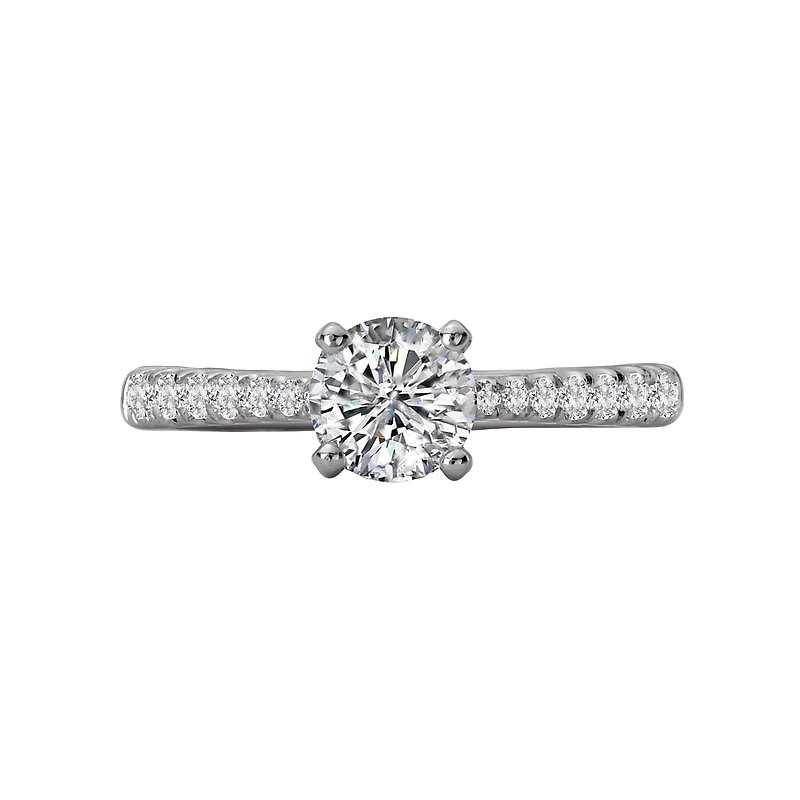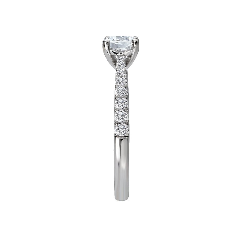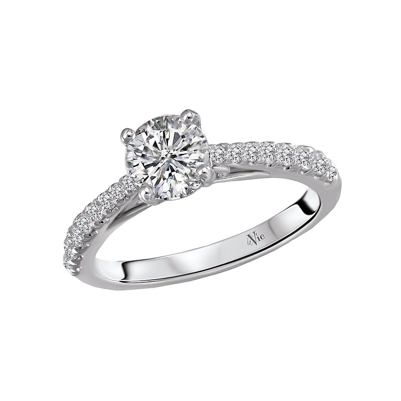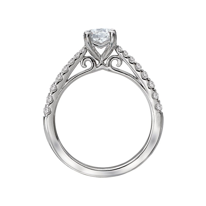 This ring created in 14k white gold features tapered diamonds on the shank with a center setting that will accommodate a 5.8mm round center. (D 1/3 carat total weight)