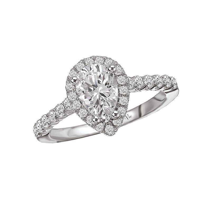 This elegant bridal ring features a halo of sparkling round diamonds set in high polished 14k white gold. (D 1/3 carat total weight) This ring is a SEMI-MOUNT and it comes with NO CENTER STONE as shown but it will accommodate a 6-7x4-4.5mm center stone.