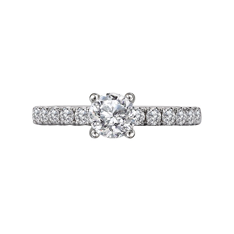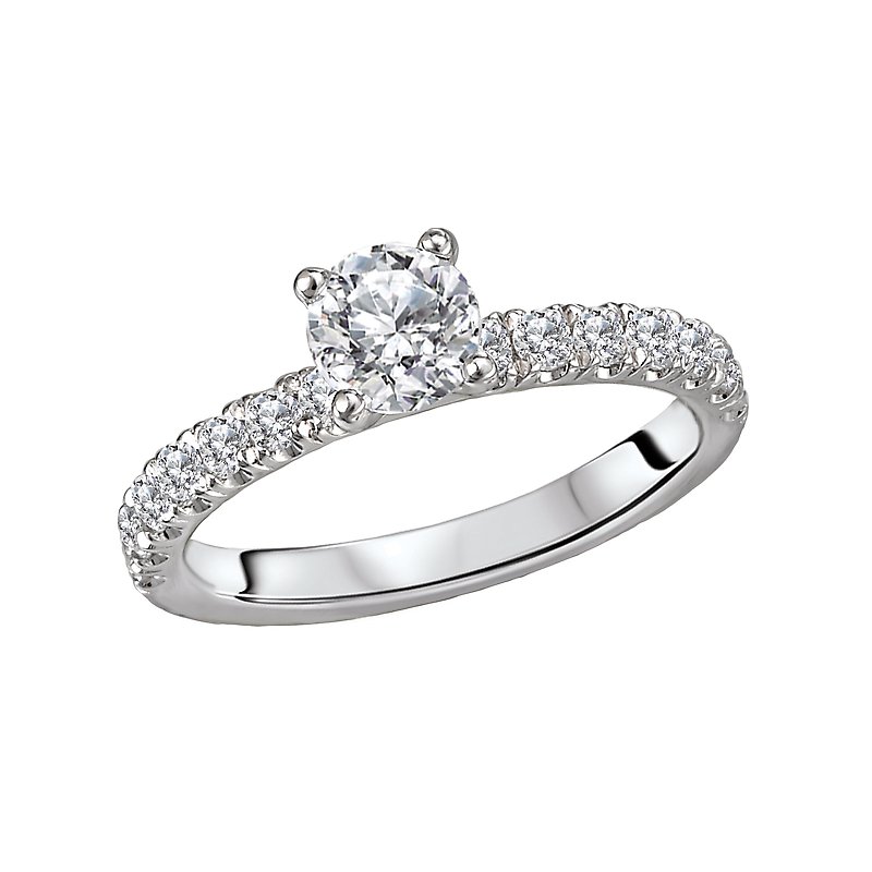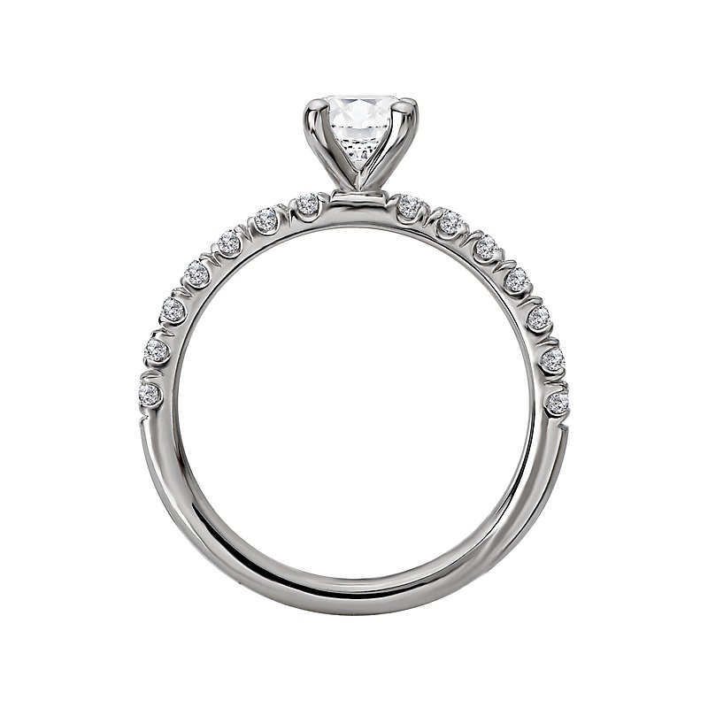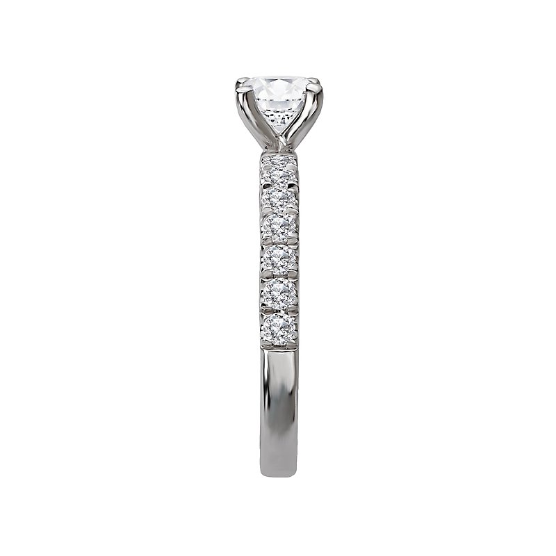 This semi-mount engagement ring has sparkling diamonds along the shank on either side of a center setting that will accommodate a 5.07-5.25mm round center. (D 3/8 carat total weight)