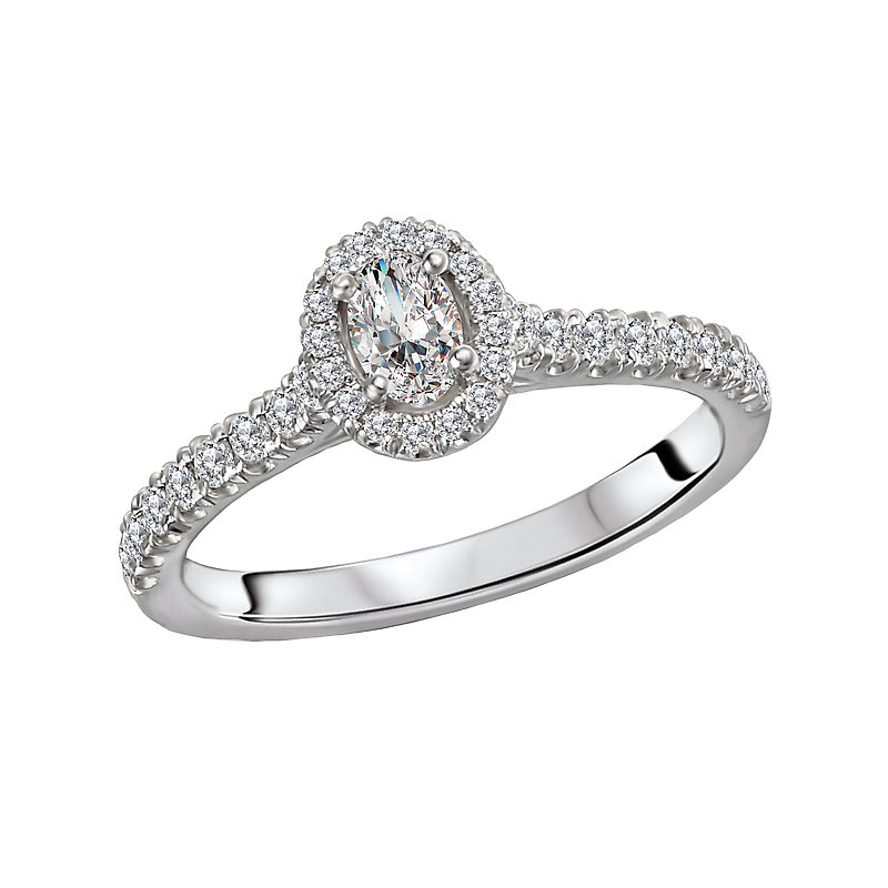 This 14kt white gold engagement ring has diamonds along the shaft and a halo of diamonds surrounding an oval center diamond. (D 1/2 carat total weight, including a 4.4x3.3mm oval center)