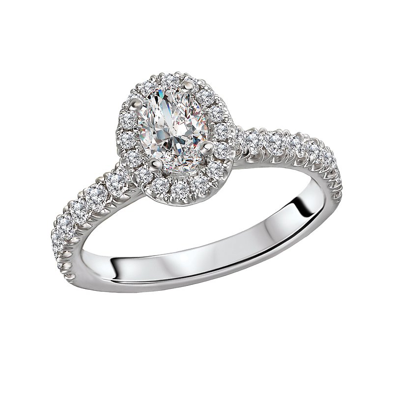 This 14kt white gold engagement ring has diamonds along the shaft an a halo of diamonds surrounding an oval shaped center stone. (D 1 carat total weight, including a 6.1x4.4mm oval shaped diamond)