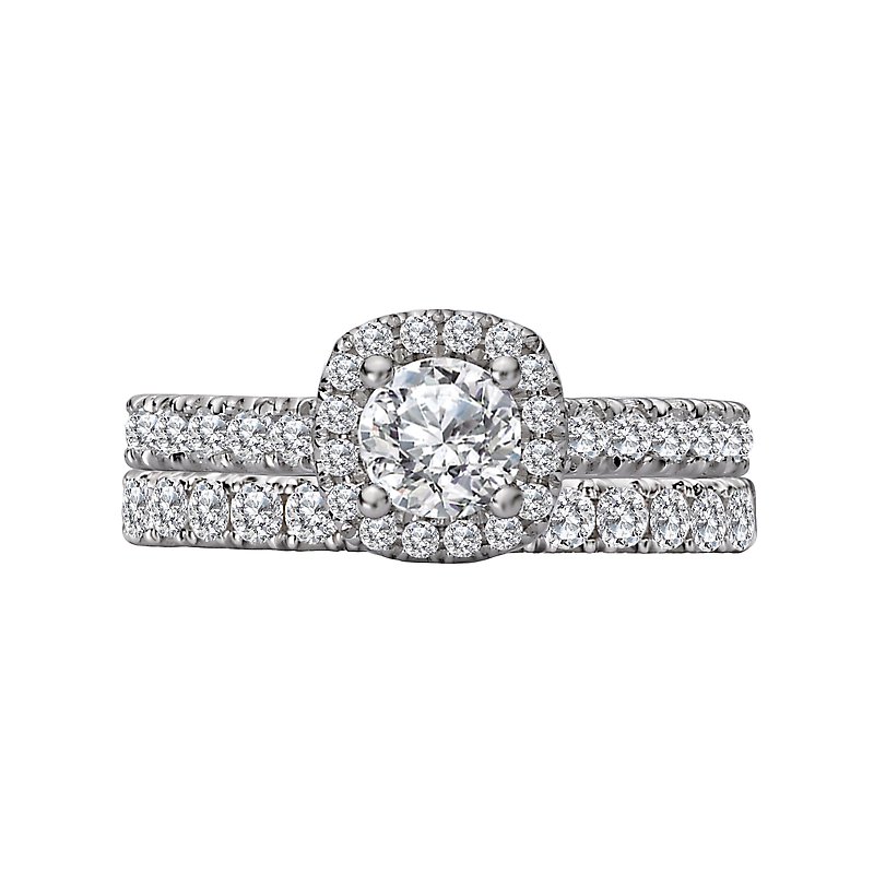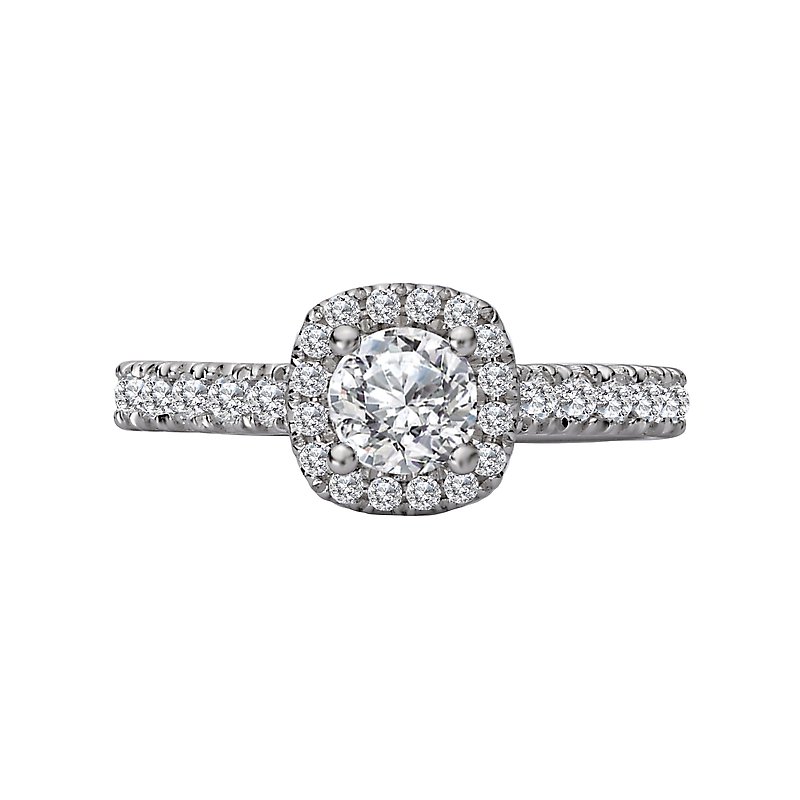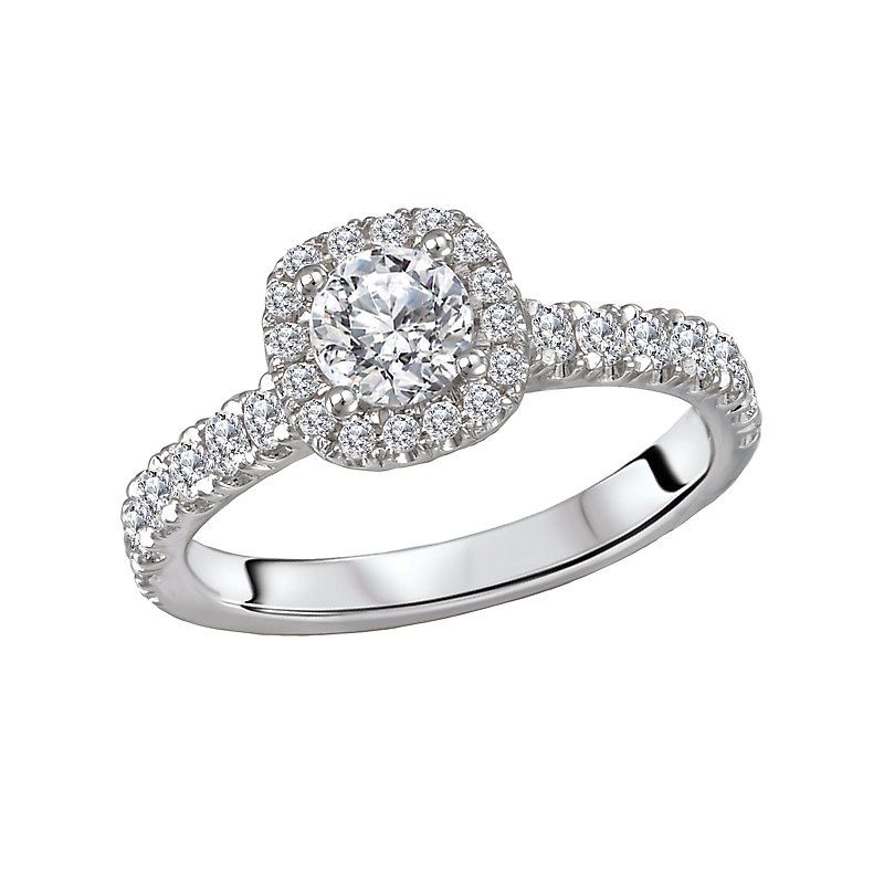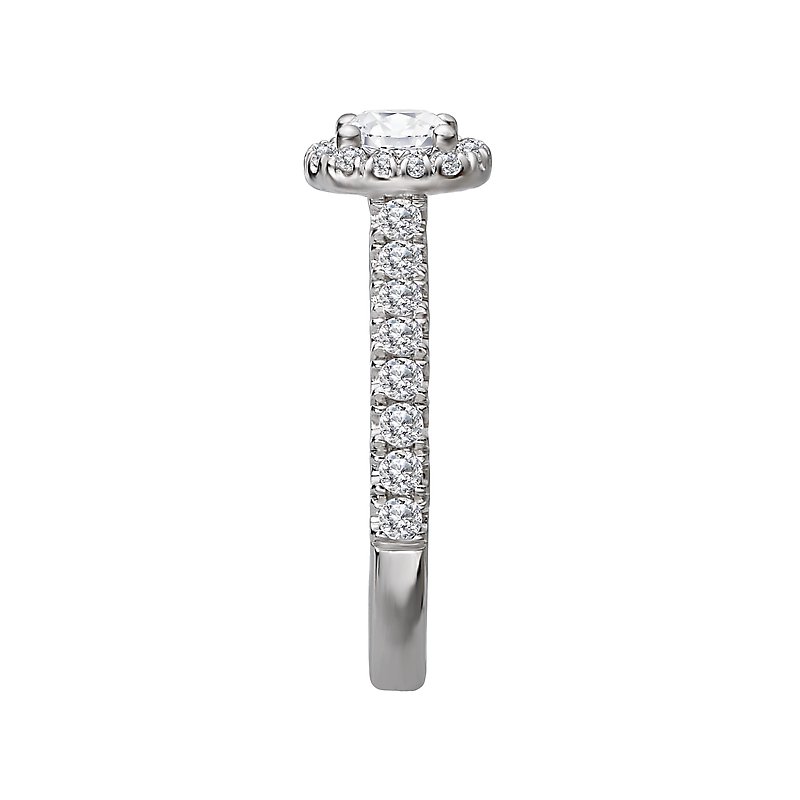 This 14kt white gold engagement ring has diamonds along the shaft and a halo of diamonds that surround a beautiful round center. (D 1 carat total weight, including a 4.67-5.06mm round diamond)