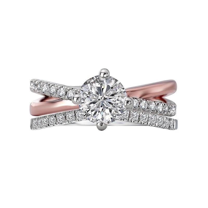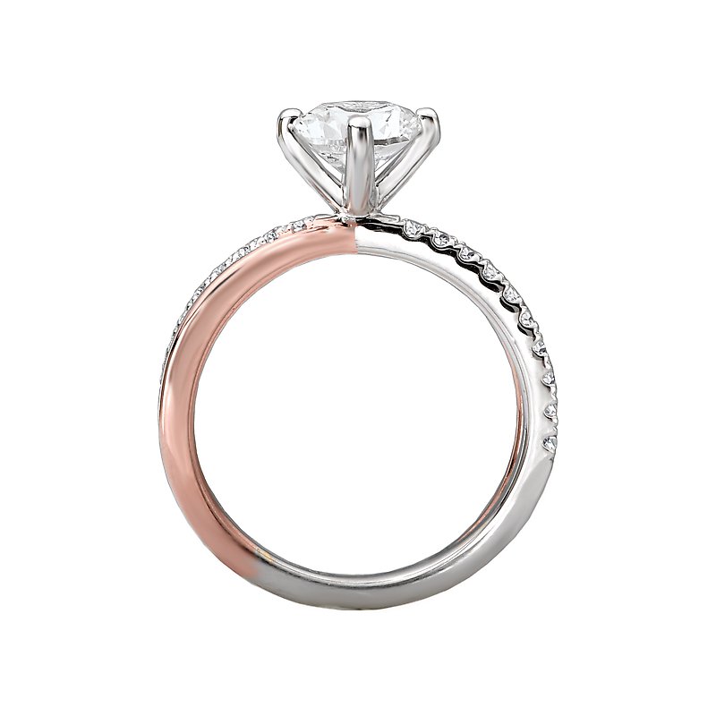 *** Lab Grown Diamond *** Dazzling engagement ring created in high polished 14kt white and rose gold showcases brilliant cut diamonds aligning the criss cross shank surrounding the center stone setting that will accommodate a round 6.5mm diamond or gemstone. (D 1/5 carat total weight)