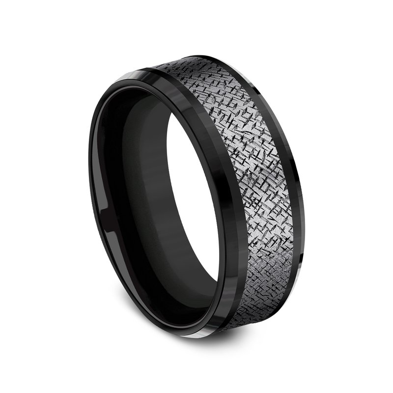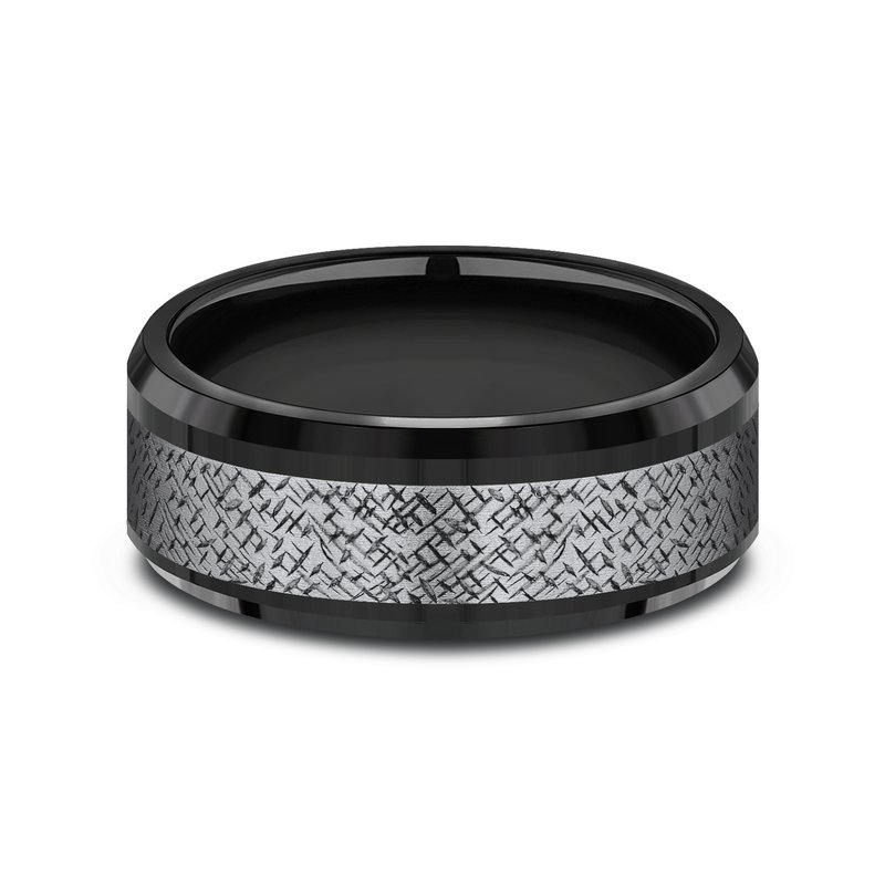 8mm, Comfort fit Black Titanium and Grey Tantalum Cross hatch patterned center, bevel edges