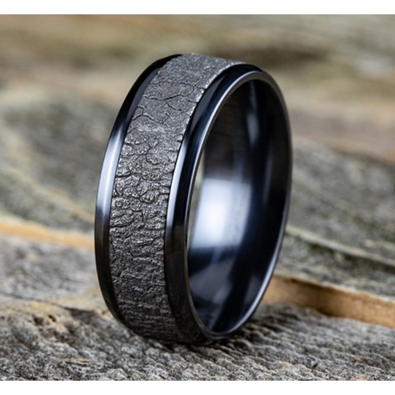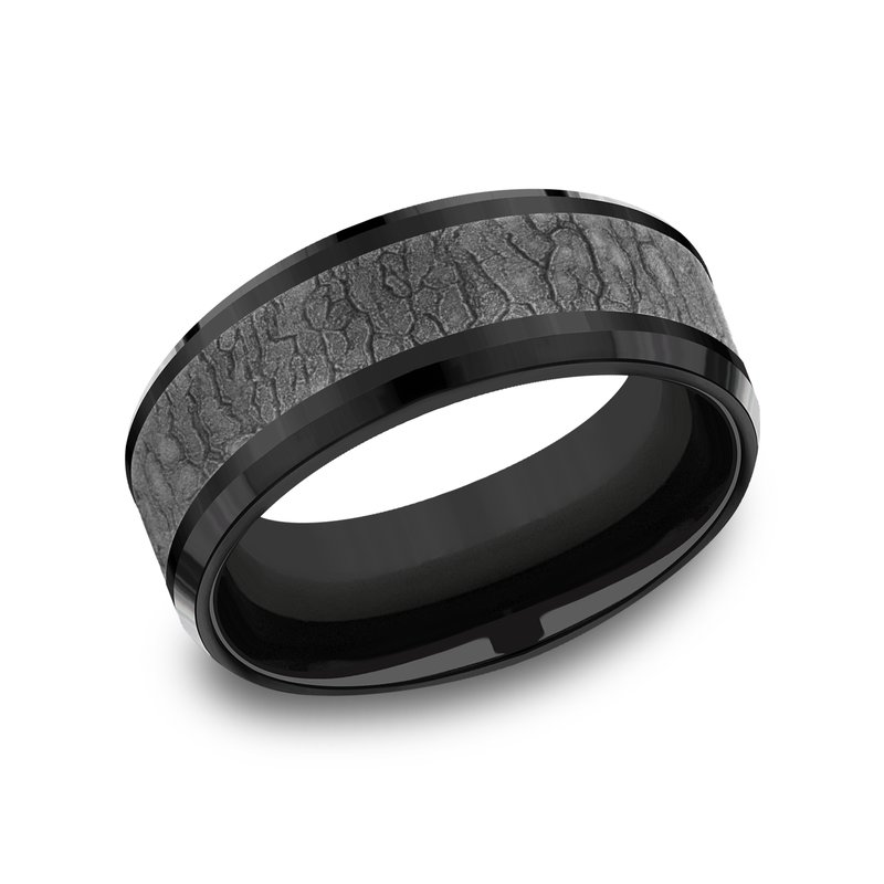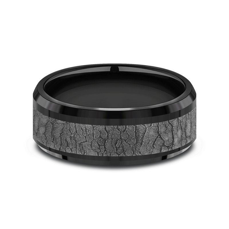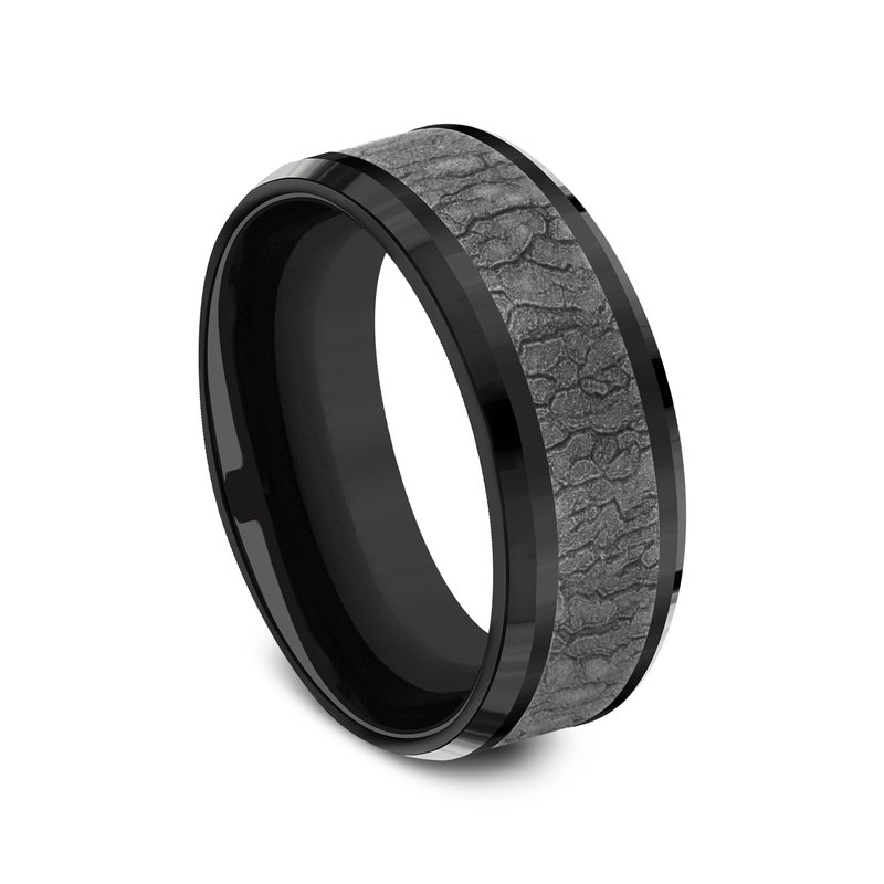 8mm, Comfort fit Black Titanium and Grey Tantalum Tree bark patterned center, polished drop bevel edges