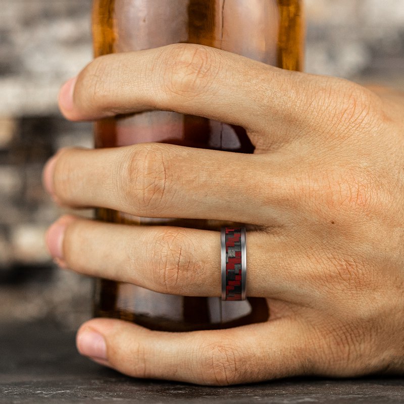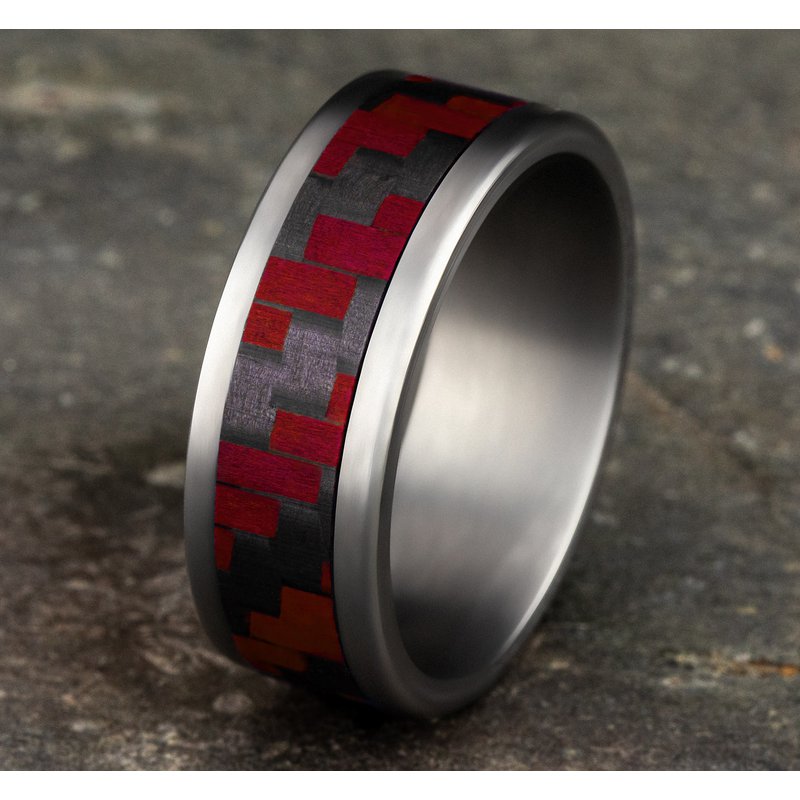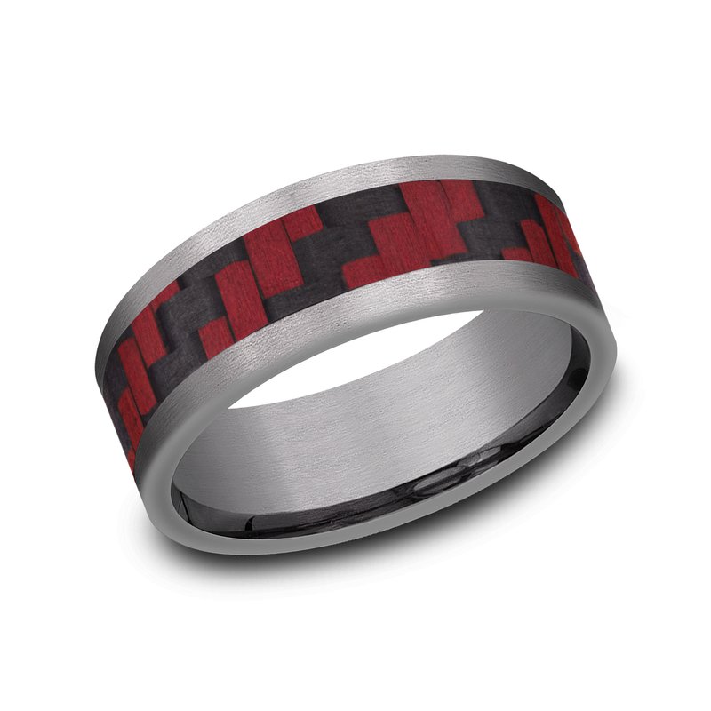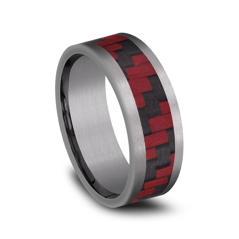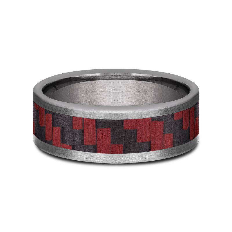 8mm, Comfort fit Grey Tantalum and Red Carbon Fiber Twilled Carbon Fiber pattern, straight edges