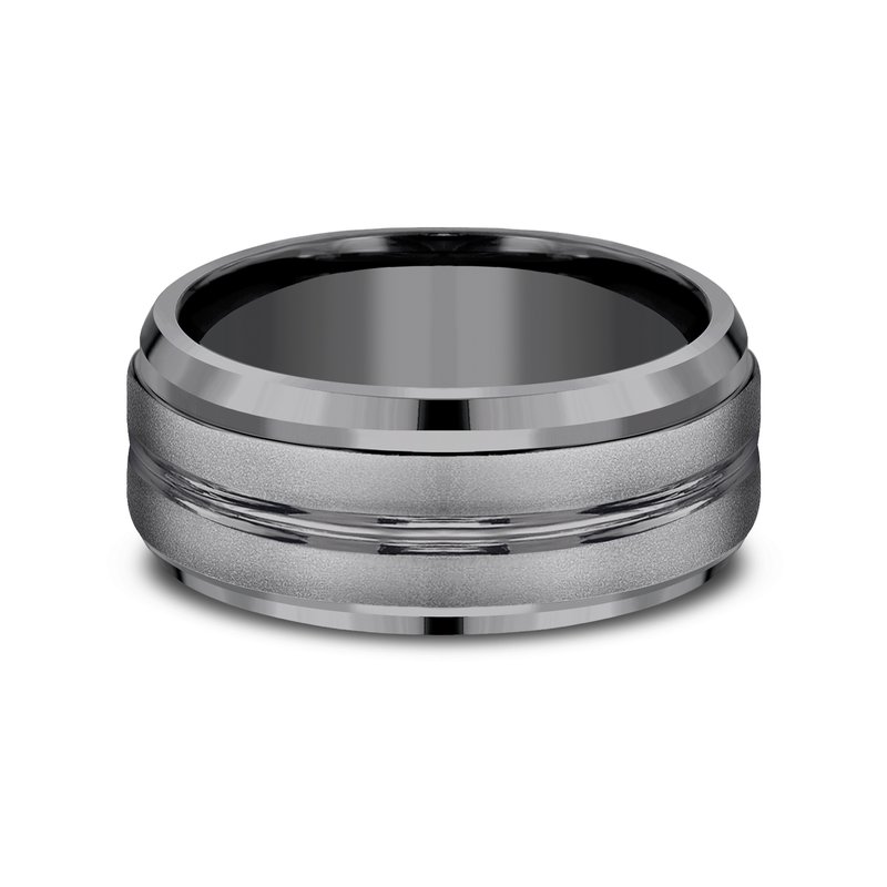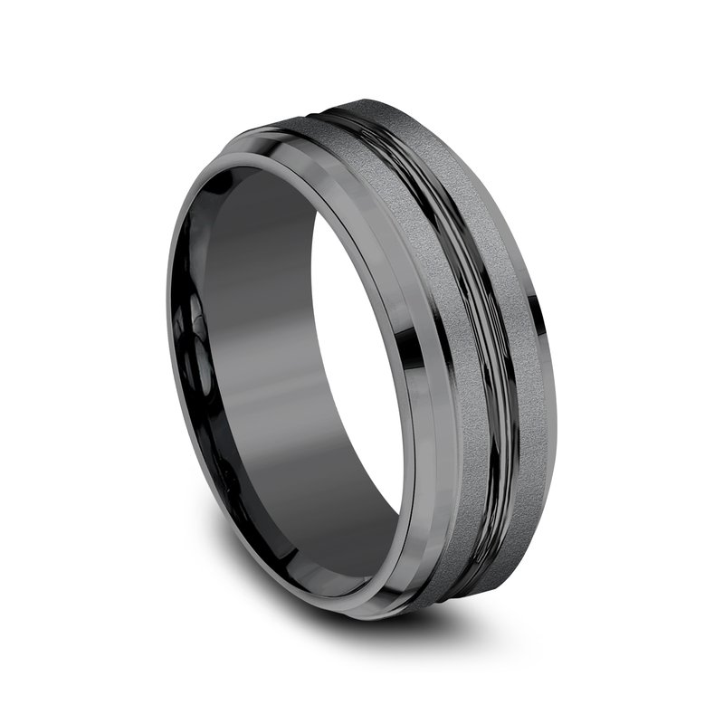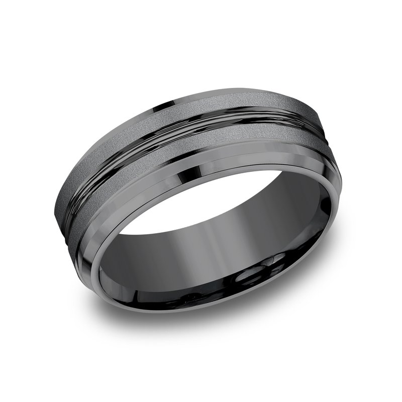 8mm, Comfort fit Darkened Tantalum Satin finish, polished double center cuts and drop bevel edges