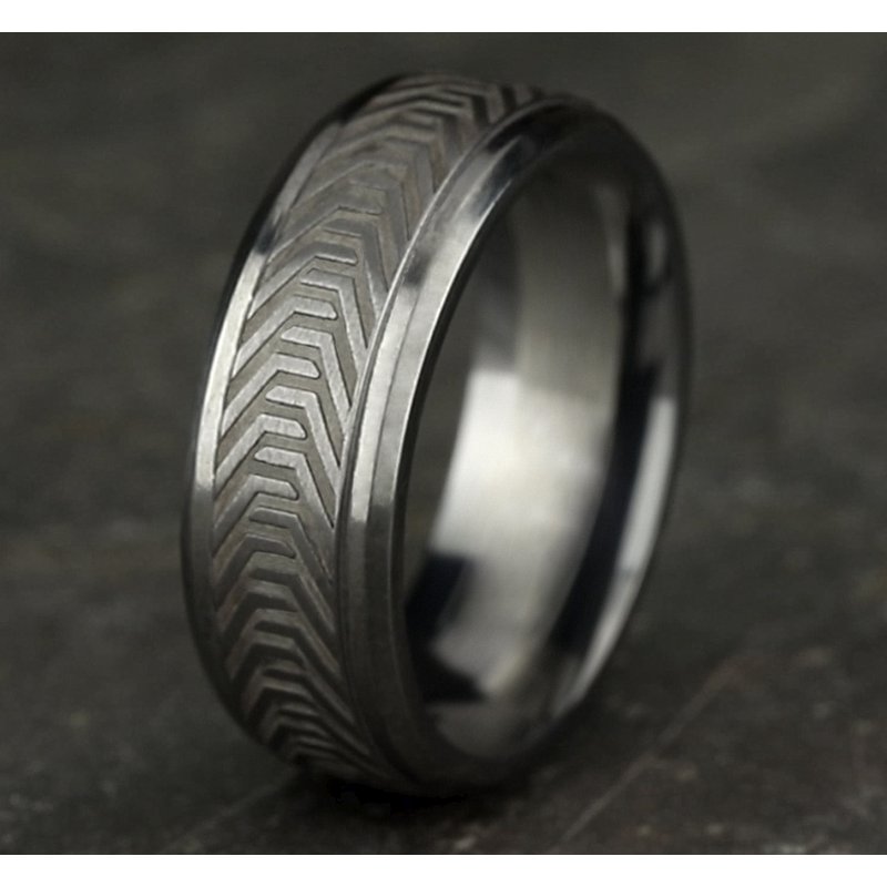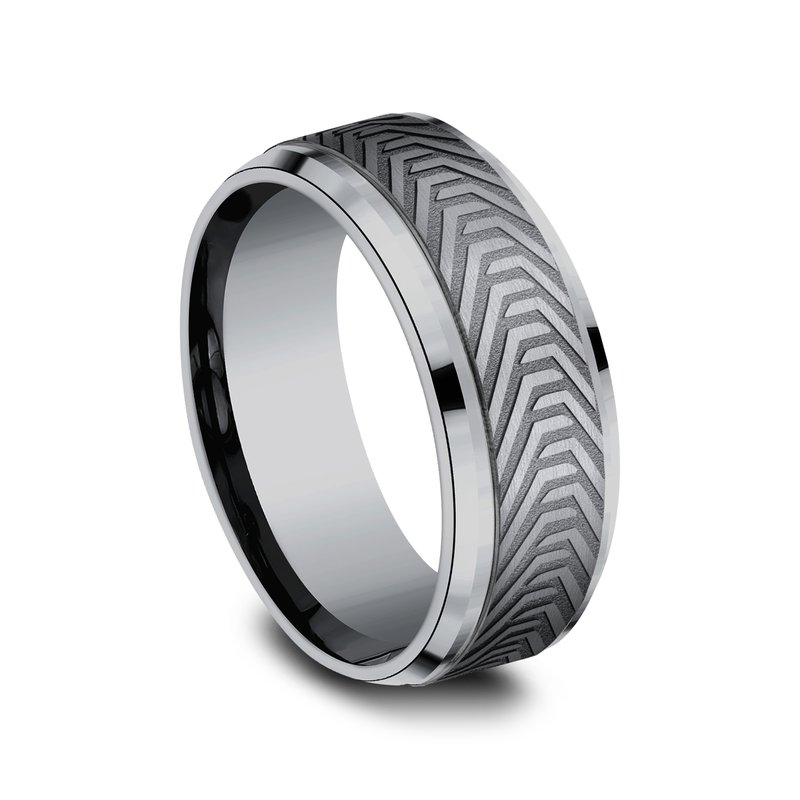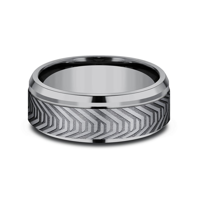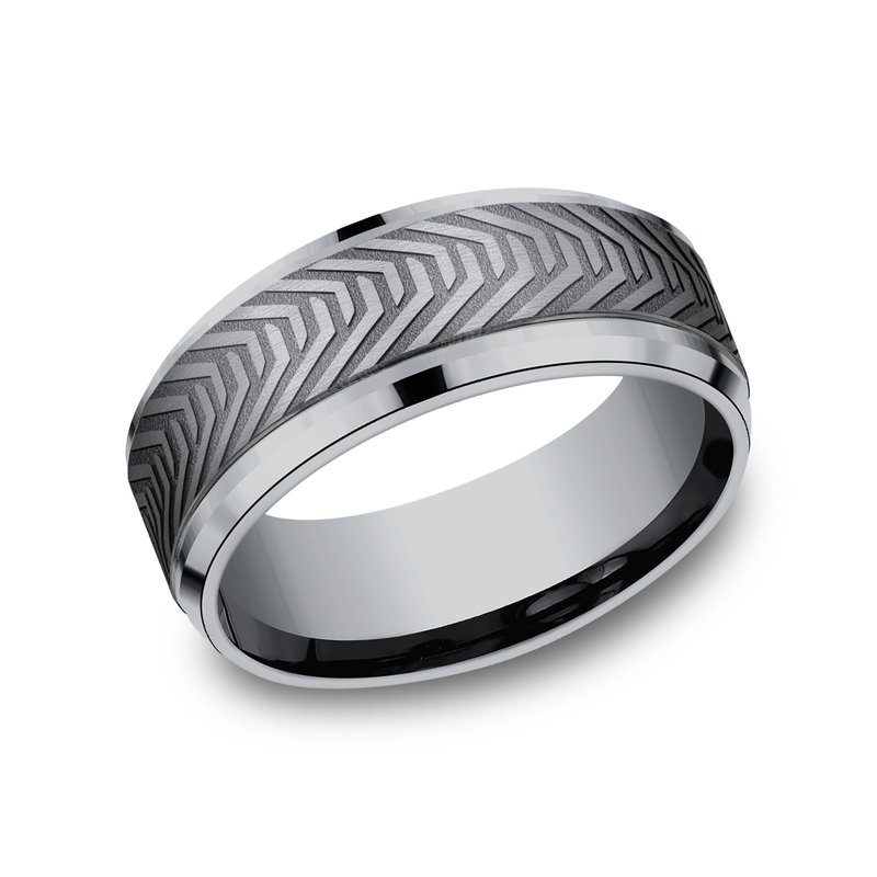 8mm, Comfort fit Grey Tantalum Tire tread patterned center, polished bevel edges