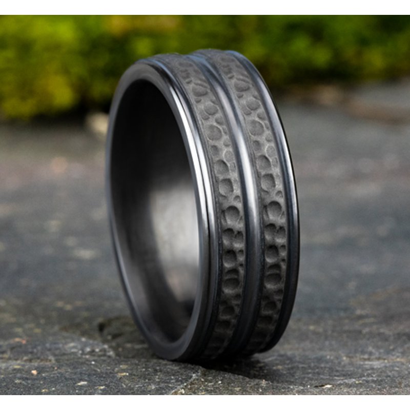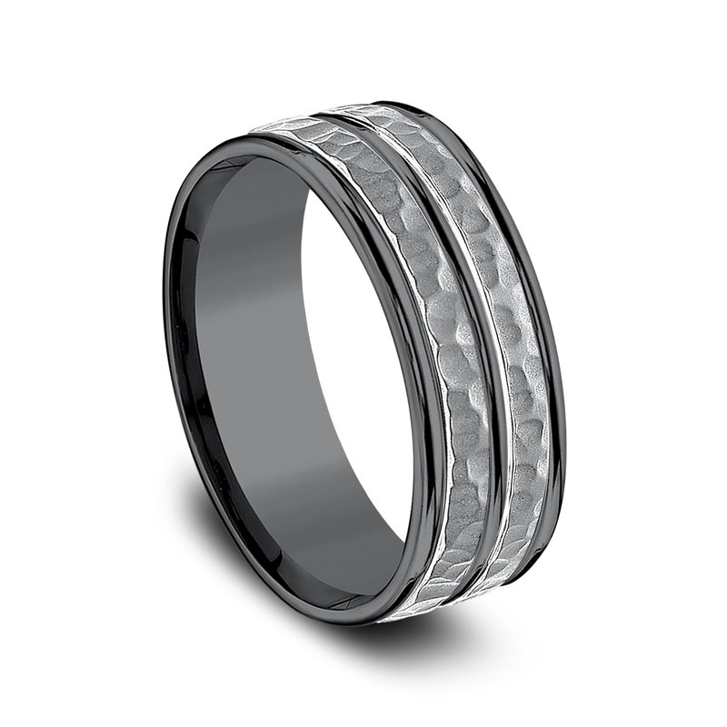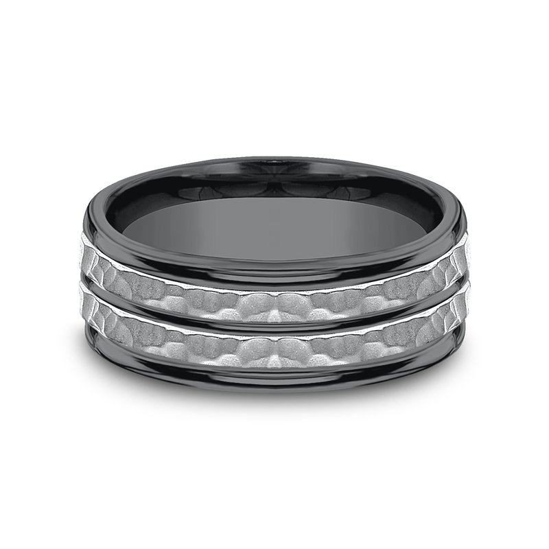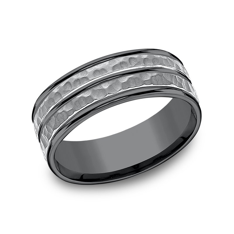 8mm, Comfort fit Darkened Tantalum Hammered finish and polished center cut, round edges