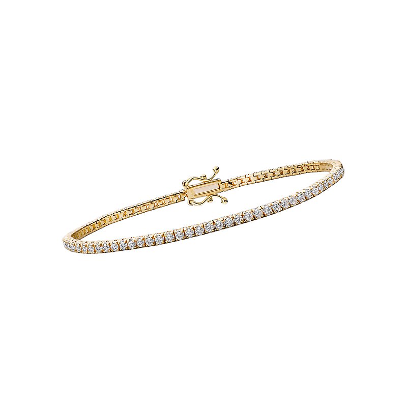 This diamond bracelet is lined with round diamonds all set in 14kt yellow gold four prong settings. (D 2 carat total weight)