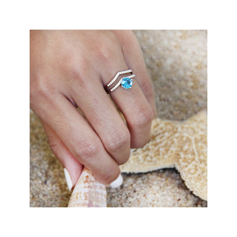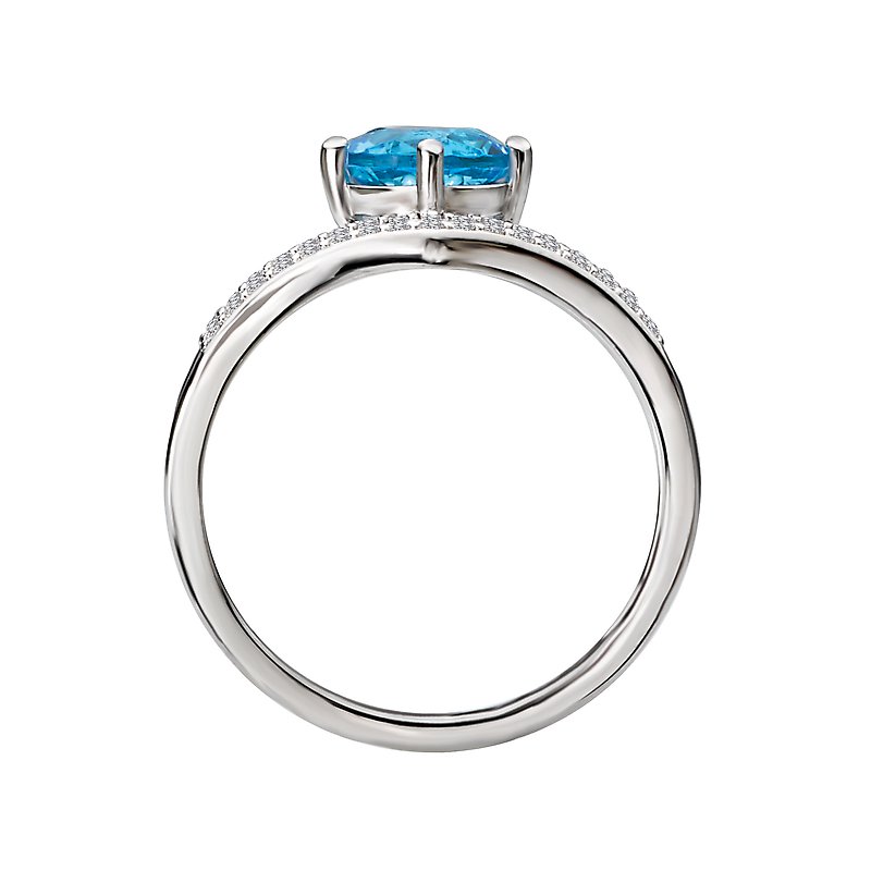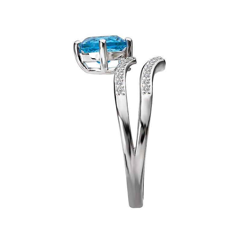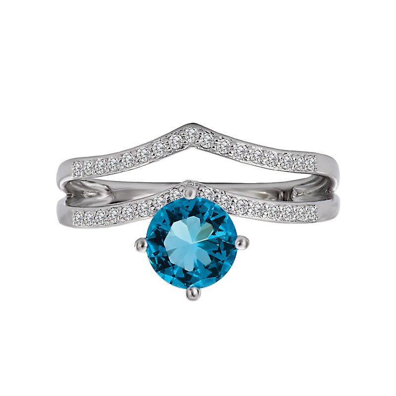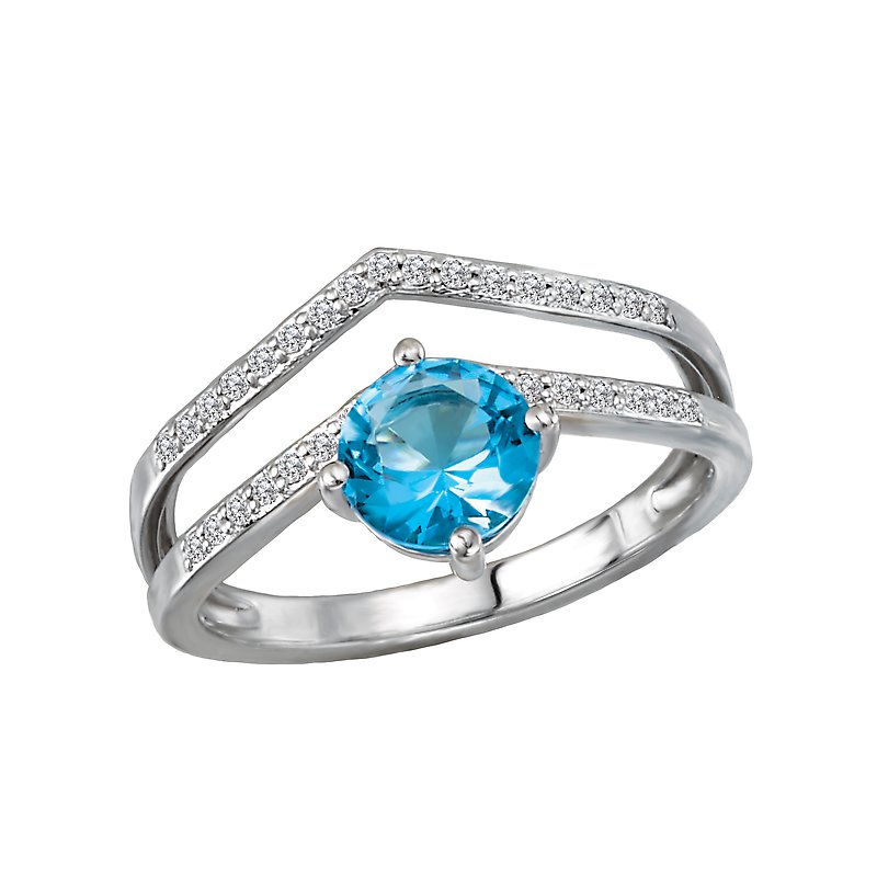 This beautiful 14kt white gold ring features a split shank lined with diamonds and a 1 carat blue topaz. (D 1/5 carat total weight, BT 1 carat total weight)