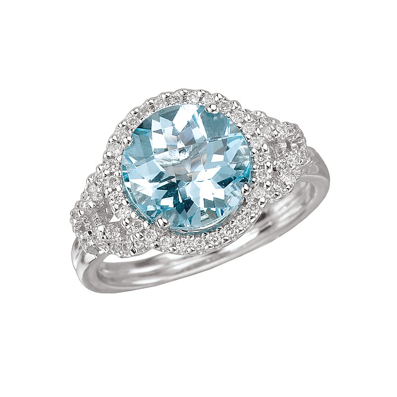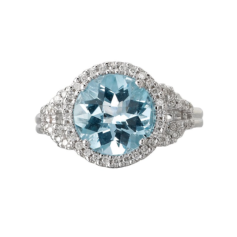 Round Faceted 9mm Blue Topaz Ring Surrounded by a Halo of Diamonds in 14kt White Gold. (D 1/4 carat weight) Size 7