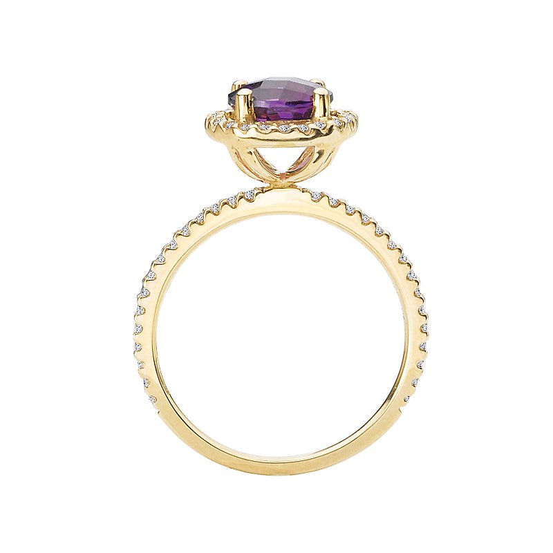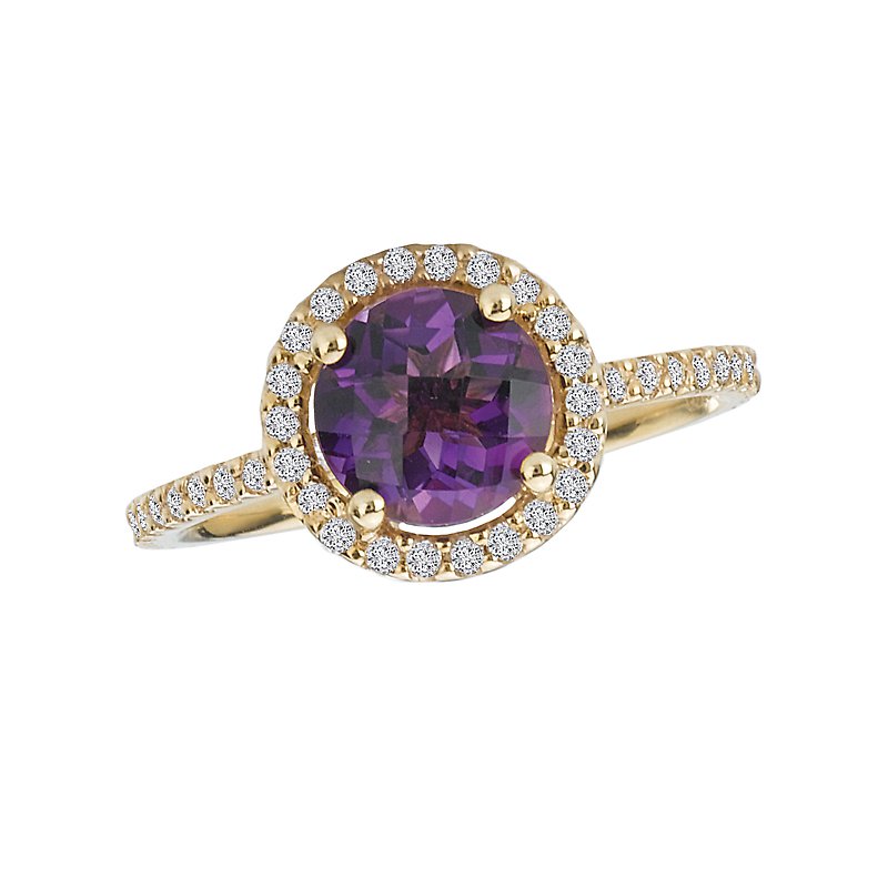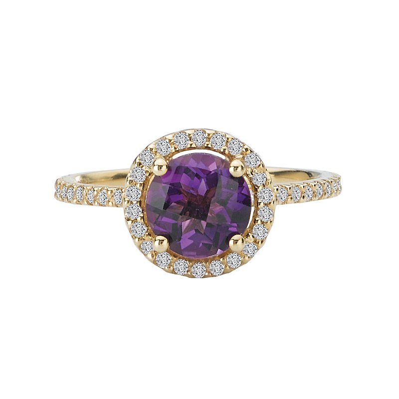 This ring features a round halo of sparkling 1/4ctw diamonds surrounding the beautiful faceted 7mm amethyst center. The ring is created in high polished 14k yellow gold.