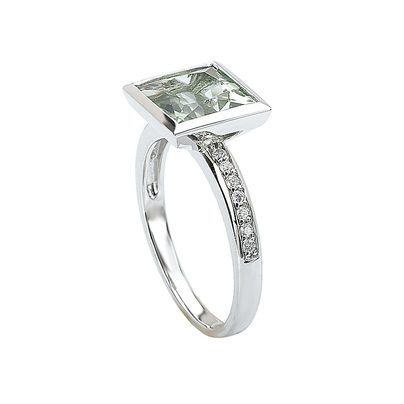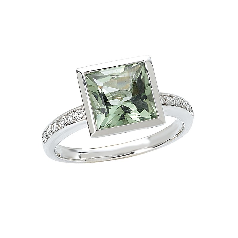 Diamond line the shank of this ring which has a beautiful princess cut 8x8mm green amethyst ring all set in 14kt white gold. (D 1/8 carat total weight, G-AM 2.35 total gem weight) Size 7
